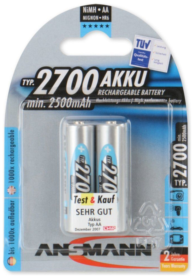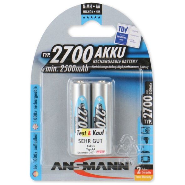 Τάση 1,2V{Τύπος} Μπαταρία . {Τύπος} Μπαταρία . {Τάση} 1,2V . {Τάση} 1,2V . {Χωρητικότητα} 2700 mAh. {Χωρητικότητα} 2700 mAh. {Τεχνολογία} Υδρίδιο μετάλλου Νικελίου (NiMH) . {Τεχνολογία} Υδρίδιο μετάλλου Νικελίου (NiMH) . {Ποσότητα} 2 τεμ. {Ποσότητα} 2 τεμ. {Μέγεθος}AA/R6. {Μέγεθος}AA/R6