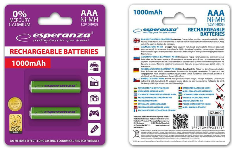 Akumulatorki Esperanza łączą najnowszą technologię nowoczesnych akumulatorków niklowo-wodorkowych z zaletami tradycyjnych baterii alkalicznych i znakomicie je zastępują. Jednocześnie wpływają na mniejsze zanieczyszczenie środowiska naturalnego oraz umożliwiają osiągnięcie znacznych oszczędności finansowych. Poprzez zoptymalizowanie technologii ogniw z możliwością ładowania oraz zastosowanie w produkcji wysokiej jakości komponentów zminimalizowany został efekt samorozładowania. Akumulatorki Esperanza po roku zachowują 85% swojej nominalnej pojemności.