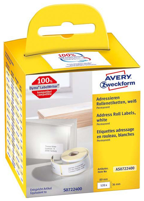 "Etykiety w rolce do termodruku • Etykiety w rolce do termodruku są w 100% kompatybilne z DYMO LabelWriter ™ oraz Seiko Smart Label Printer®. • Najwyższa jakość Avery Zweckform teraz dostępna również w ofercie etykiet do termodruku. • Gwarancja niezawodnego zadruku i pewnego przylegania etykiety. • Szeroka oferta rozmiarów etykiet odpowiada modelom Dymo®. • Dostępne są modele: z klejem trwałym lub z klejem usuwalnym. • Dostępne są również małe opakowania ekonomiczne, z mniejszą ilością etykiet na rolce, idealne dla osób z niewielkim zapotrzebowaniem na dany rodzaj etykiety. • Etykiety można projektować i drukować korzystając z oprogramowania Dymo® lub Seiko®. "