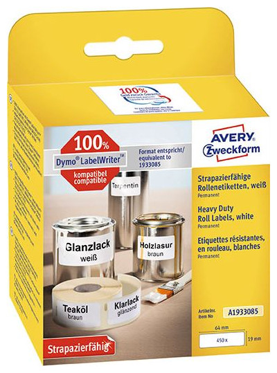 Ετικέτες Heavy Duty σε ρολό για θερμική εκτύπωση, ετικέτες σε ρολό για θερμική εκτύπωση είναι 100% συμβατές με το DYMO LabelWriter™ και το Seiko Smart Label Printer®. πολυεστερικές ετικέτες για δημιουργία επιγραφών, πινακίδων και σημάνσεων σε παραγωγή και αποθήκες, πολύ ανθεκτικές και αδιάβροχες, κολλάνε σταθερά σε δύσκολες επιφάνειες, για εξωτερική χρήση, ανθεκτικές σε βρωμιές, χημικά και θερμοκρασίες από -20 έως +60°C, υψηλότερης ποιότητας Avery Zweckform τώρα διατίθεται και στην προσφορά ετικετών θερμικής εκτύπωσης, μέγεθος: 19x64mm, περιεχόμενο: 450 ετικέτες, 1 ρολό.Χαρτί {Type}. Χαρτί {Type}. {Χρώμα ταινίας} Λευκό . {Χρώμα ταινίας} Λευκό . {Width [mm]} 64 . {Width [mm]} 64