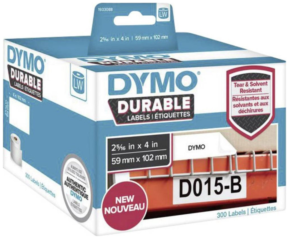 DYMO Ανθεκτικό. Χρώμα προϊόντος: Λευκό, Τύπος ετικέτας: Αυτοκόλλητες ετικέτες εκτύπωσης, Υλικά: Πολυπροπυλένιο (PP). Πλάτος ετικέτας: 10,2 cm, Ύψος ετικέτας: 5,9 cm. Αριθμός ετικετών ανά συσκευασία: 300 τεμ., Αριθμός ετικετών σε ρολό: 300 τεμ.