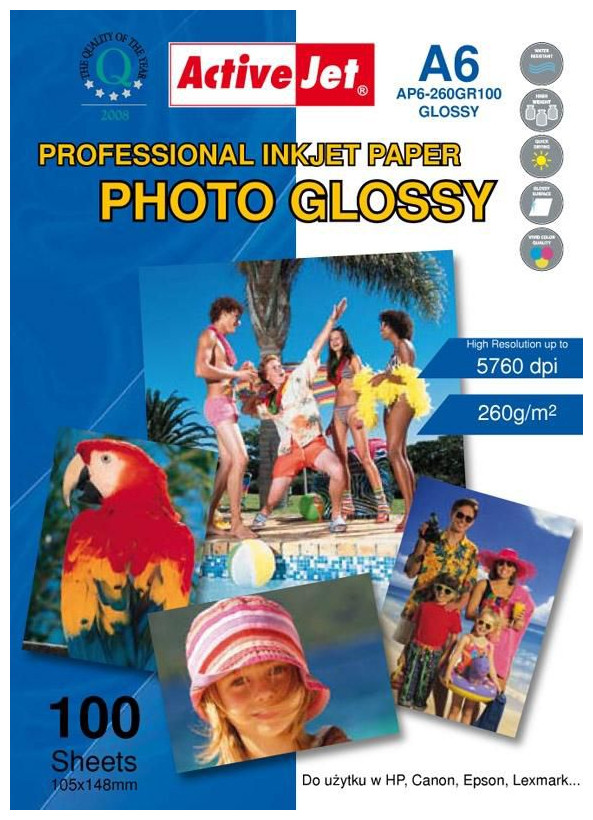 Φωτογραφικό χαρτί A6 για εκτύπωση inkjet, γυαλιστερό, αδιάβροχο, επίστρωση ρητίνης, διαστάσεις: 105x148 mm, βάρος 260 g/m2. 100 τεμάχια ανά συσκευασία. Εφαρμογή: εκτύπωση φωτογραφιών, καλλιτεχνικά γραφικά, επαγγελματικές παρουσιάσεις, εξώφυλλα εκδόσεων.
