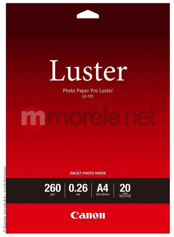 Pro Luster LU-101Papier fotograficzny Pro Luster zapewnia atrakcyjne wydruki fotograficzne w kolorze i trybie monochromatycznym. Jest to profesjonalny papier fotograficzny o błyszczącej fakturze, dzięki któremu jakość odbitek znaną z tradycyjnych punktów fotograficznych można uzyskać w domu.ProfesjonaliściTen gładki, satynowy papier fotograficzny do drukarek atramentowych przypomina tradycyjny papier powlekany żywicą używany w ciemniach fotograficznych. Został opracowany z myślą o profesjonalnych fotografach, którzy chcą prezentować swoje prace w atrakcyjnej formie bez konieczności korzystania z usług punktu fotograficznego.Znakomite odbitkiPapier fotograficzny Pro Luster zapewnia spójny wygląd odbitek, dynamiczne odwzorowanie kolorów i wyraziste szczegóły, a także niesamowite odbitki monochromatyczne, z nasyconą czernią i płynną gradacją odcieni.Zdjęcia na całe życiePapier fotograficzny Pro Luster, zoptymalizowany pod kątem drukarek fotograficznych PIXMA Pro firmy Canon, zapewnia wyjątkową jakość i trwałość zdjęć. W przypadku używania oryginalnych tuszów LUCIA lub ChromaLife100+ firmy Canon omawiany papier zapobiega pogorszeniu jakości odbitek wskutek kontaktu z gazami i światłem, dzięki czemu chroni cenne wspomnienia i pozwala prezentować i sprzedawać zdjęcia bez obaw.Niezmienna jakośćKrótki czas schnięcia, odporność na wodę i bardziej błyszcząca powierzchnia niż w przypadku papieru półbłyszczącego są efektem zastosowania powłoki o delikatnej strukturze. Spójność odcieni i kolorów zdjęcia — bez względu na oświetlenie, w którym jest prezentowana odbitka — sprawia, że omawiany papier świetnie sprawdzi się w studiach fotograficznych i na wystawach.
