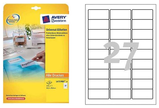 Avery Zweckform Avery Zweckform ετικέτες 63.5mm x 29.6mm, A4, λευκές, 27 ετικέτες, αποσπώμενες, συσκευασία 25 τεμαχίων, L4737REV-25, για εκτυπωτές laser - L4737REV-25