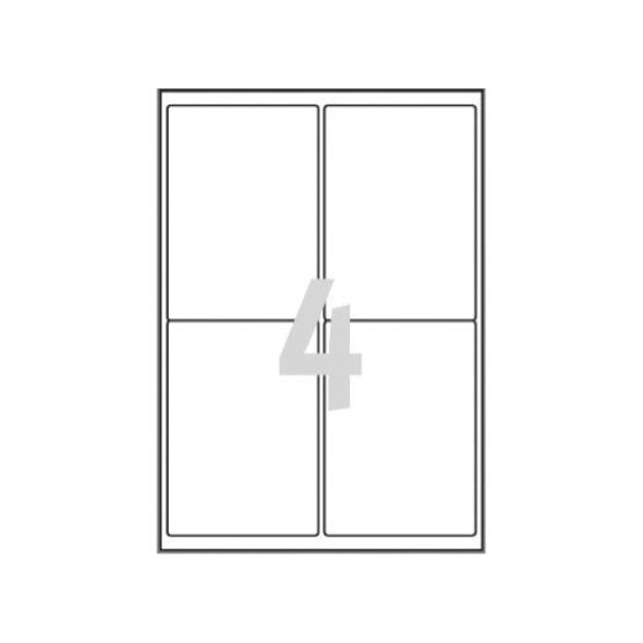 Αυτοκόλλητες ετικέτες από λευκό πολυεστέρα. εξαιρετικά ανθεκτικό σε δυσμενείς περιβαλλοντικές συνθήκες. αδιάβροχο, ανθεκτικό σε λίπη, βρωμιά, θερμοκρασία από -20°C έως +80°C. ιδανικό για τη σήμανση προϊόντων και την απογραφή πάγιων περιουσιακών στοιχείων. προορίζεται για εκτυπωτές λέιζερ. 20 φύλλα ανά συσκευασία. μέγεθος: 99,1x139 mm; 4 ετικέτες σε ένα φύλλο - 2x2. 80 ετικέτες ανά συσκευασία.{Μορφή} A4 . {Type} Universal