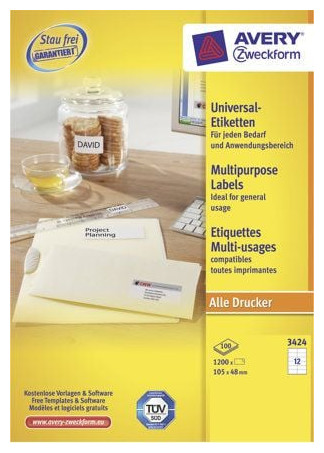 Αυτοκόλλητες ετικέτες γενικής χρήσης, μεγέθους 105 x 48 mm, 1200 ετικέτες{Αριθμός φύλλων [τεμ]} 100 . {Αριθμός φύλλων [τεμ]} 100 . {Μορφή} A4 . {Format} A4