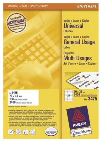 Αυτοκόλλητες ετικέτες γενικής χρήσης, μεγέθους 70 x 36 mm, 2400 ετικέτες{Αριθμός φύλλων [τεμ]} 100 . {Αριθμός φύλλων [τεμ]} 100 . {Μορφή} A4 . {Format} A4