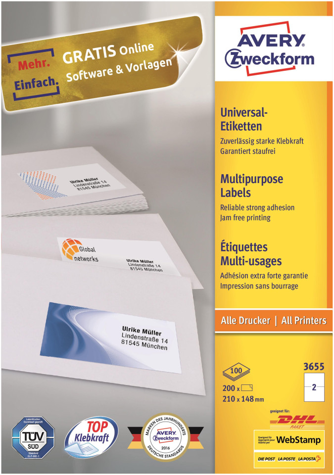 Avery Zweckform Universal-Labels Inkjet, Laser Colorlaser copier white 210x297mm 200 labels - 3655