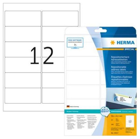 Repozycjonowane etykiety adresowe na arkuszach A4. Z technologią Movables®: odklejane i ponownie przyklejane |Pewne przywieranie do wszystkich materiałów opakowaniowych: Koperty, paczki, rolki wysyłkowe, folie|Zdejmowanie bez pozostałości, bez uszkodzenia podłoża|Bezproblemowa zmiana pozycji i wielokrotne ponowne przyklejanie|Bardzo dobre rezultaty drukowania na drukarkach laserowych i atramentowych, kopiarkach, kolorowych drukarkach laserowych i kopiarkach kolorowych Łatwe i szybkie opisywanie za pomocą bezpłatnego oprogramowania dostępnego na stronie http://www.herma.de/software|300 Etykiety
