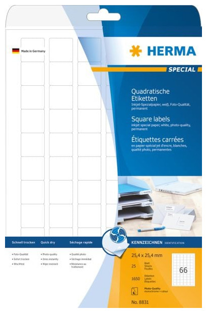 Αυτοκόλλητες ετικέτες InkPrint 8831, σε φύλλα Α4. Κατασκευασμένο ειδικά για εκτυπωτές inkjet από υψηλής ποιότητας χαρτί 90 g/m², το οποίο εγγυάται τέλεια αναπαραγωγή περιγραμμάτων και χρωμάτων σε φωτογραφική ποιότητα. Οι ετικέτες εξασφαλίζουν απρόσκοπτη λειτουργία στον εκτυπωτή χάρη στην ειδική άκρη ασφαλείας και τη βέλτιστη ομαλότητα. Είναι επίσης κατάλληλα για εκτυπωτές inkjet με δύσκολη καθοδήγηση χαρτιού. Υποστήριξη για σχεδιασμό και εκτύπωση ετικετών: www.herma.de/software.