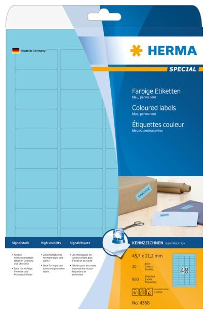 Χρωματιστές ετικέτες 4368, αυτοκόλλητες, σε φύλλα Α4. Ιδανικό για προειδοποιητικές πινακίδες, πληροφορίες αλλαγής διεύθυνσης, χρωματική κωδικοποίηση, προσφορές στα καταστήματα, κ.λπ. Φιλικές προς το περιβάλλον ετικέτες: χαρτί υψηλής ποιότητας λευκασμένο χωρίς τη χρήση χλωρίου, κόλλα χωρίς διαλύτες, με πιστοποίηση PEFC. Οι ετικέτες και οι συσκευασίες είναι 100% ανακυκλώσιμες. Πολύ καλή ποιότητα εκτύπωσης σε όλους τους ασπρόμαυρους και έγχρωμους εκτυπωτές και φωτοαντιγραφικά laser και inkjet. Οι ετικέτες εξασφαλίζουν απρόσκοπτη λειτουργία σε οποιονδήποτε εκτυπωτή χάρη στο ειδικό άκρο ασφαλείας και τη βέλτιστη ομαλότητα. Υποστήριξη για σχεδιασμό και εκτύπωση ετικετών: www.herma.de/software.{Μορφή} A4 . {Μορφή} A4 . {Αριθμός φύλλων [τεμ]} 20 . {Αριθμός φύλλων [τεμ]} 20 . {Type} Universal . {Type} Universal