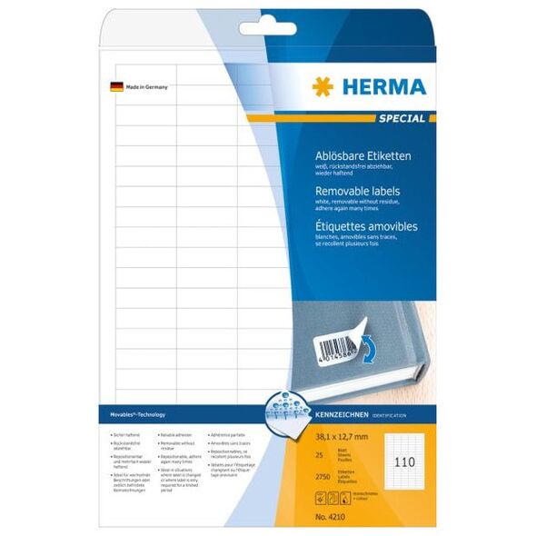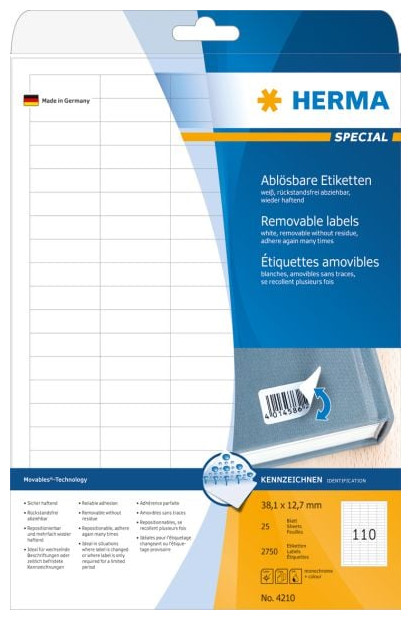Αυτοκόλλητες ετικέτες 4210, σε φύλλα Α4. Κατασκευασμένα με τεχνολογία Movables® - προσκολλώνται με ασφάλεια σε όλες τις λείες, στεγνές, άθικτες και απαλλαγμένες από βρωμιές επιφάνειες. Αφού ξεκολλήσουν, δεν αφήνουν ίχνη κόλλας και δεν καταστρέφουν την επιφάνεια στην οποία κολλήθηκαν. Μπορούν να κολληθούν ξανά. Ιδανικό για "προσωρινή" κόλληση σε ευαίσθητες επιφάνειες που δεν πρέπει να καταστραφούν. Πολύ καλά αποτελέσματα εκτύπωσης σε όλους τους έγχρωμους και ασπρόμαυρους εκτυπωτές και φωτοαντιγραφικά λέιζερ. Οι ετικέτες εξασφαλίζουν απρόσκοπτη λειτουργία στους εκτυπωτές χάρη σε μια ειδική άκρη ασφαλείας και βέλτιστη ομαλότητα φιλικό προς το περιβάλλον: υψηλής ποιότητας χαρτί λευκασμένο χωρίς τη χρήση χλωρίου, με πιστοποίηση PEFC - η διαδικασία παραγωγής δεν συμβάλλει στην εξάντληση των δασικών πόρων. Οι ετικέτες είναι 100% ανακυκλώσιμες σχεδιασμός και εκτύπωση: www.herma.de/software.