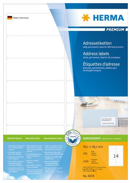 Αυτοκόλλητες ετικέτες διεύθυνσης 4678, σε φύλλα Α4, πολύ σφιχτά κολλημένες στην επιφάνεια. Είναι επίσης κατάλληλα για καθολικές εφαρμογές. Ιδανικό για όλους τους έγχρωμους και ασπρόμαυρους εκτυπωτές laser, inkjet και φωτοτυπικά. Υψηλής ποιότητας λευκό. Προσκολλώνται πολύ γρήγορα και πολύ δυνατά σε κάθε τύπο επιφάνειας, συμπεριλαμβανομένων των παγωμένων και υγρών επιφανειών. Χάρη στην ακριβή κατασκευή και τα ειδικά υλικά, είναι κατάλληλα για γρήγορη εκτύπωση εκτυπωτών (υψηλής ταχύτητας). Δεν μπλοκάρουν τους εκτυπωτές. Λεύκανση χωρίς τη χρήση χλωρίου. ουδέτερο CO2. Κόλλα χωρίς προσθήκη διαλύτη. Η συσκευασία παρέχει τις κατάλληλες συνθήκες για την αποθήκευση των ετικετών και είναι κατασκευασμένη από χαρτόνι από ανακυκλωμένες πρώτες ύλες. Υποστήριξη για σχεδιασμό και εκτύπωση ετικετών: www.herma.de/software.