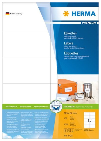 Αυτοκόλλητες ετικέτες 4425, σε φύλλα Α4, σταθερά κολλημένες. Ιδανικό για όλους τους έγχρωμους και ασπρόμαυρους εκτυπωτές laser, inkjet και φωτοτυπικά. Το υψηλό επίπεδο λευκότητας και η λεία επιφάνεια της ετικέτας εγγυώνται υψηλής ποιότητας ασπρόμαυρη και έγχρωμη εκτύπωση. Ελαφρώς πιο χοντρές, πολύ δυνατές ετικέτες, που κολλάνε εύκολα. Προσκολλώνται γρήγορα και αξιόπιστα σε οποιαδήποτε επιφάνεια, συμπεριλαμβανομένων των ψυχρών και υγρών. Δεν φράζουν τους εκτυπωτές, δεν κολλάνε στους κυλίνδρους εκτύπωσης και είναι επίσης ιδανικοί για εκτυπωτές υψηλής ταχύτητας. Εξασφαλίζουν απρόσκοπτη λειτουργία στους εκτυπωτές χάρη στο ειδικό άκρο ασφαλείας και τη βέλτιστη ομαλότητα της ετικέτας. Φιλικά προς το περιβάλλον και ανθεκτικά: λευκασμένα χωρίς χρήση χλωρίου, ουδέτερο CO2, πιστοποίηση PEFC - η διαδικασία παραγωγής τους δεν συμβάλλει στην εξάντληση των δασικών πόρων, η κόλλα δεν περιέχει διαλύτες. Υποστήριξη για σχεδιασμό και εκτύπωση ετικετών: www.herma.de/software.