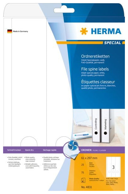 Ετικέτες αρχείου 4831, σε φύλλα Α4, αυτοκόλλητες. Εξαιρετική ποιότητα εκτύπωσης σε εκτυπωτές inkjet. Κατασκευασμένο από υψηλής ποιότητας επικαλυμμένο χαρτί με γραμμάριο 90 g/m². Σχεδιασμένα για εκτύπωση υψηλής ανάλυσης, σας επιτρέπουν να διατηρείτε και να αναπαράγετε την ποιότητα των περιγραμμάτων και των χρωμάτων σε φωτογραφική ποιότητα. Ιδανικό για λογότυπο εταιρείας και περιγραφή σε βιβλιοδεσία. Πολύ σφιχτά κολλημένο στην επιφάνεια, συνιστάται για συνδετικά που χρησιμοποιούνται συχνά. Ολόκληρη η επιφάνεια της ετικέτας είναι εκτυπώσιμη και είναι ιδανική για εκτυπωτές με κακή καθοδήγηση χαρτιού. Υποστήριξη για σχεδιασμό και εκτύπωση ετικετών: www.herma.de/software.