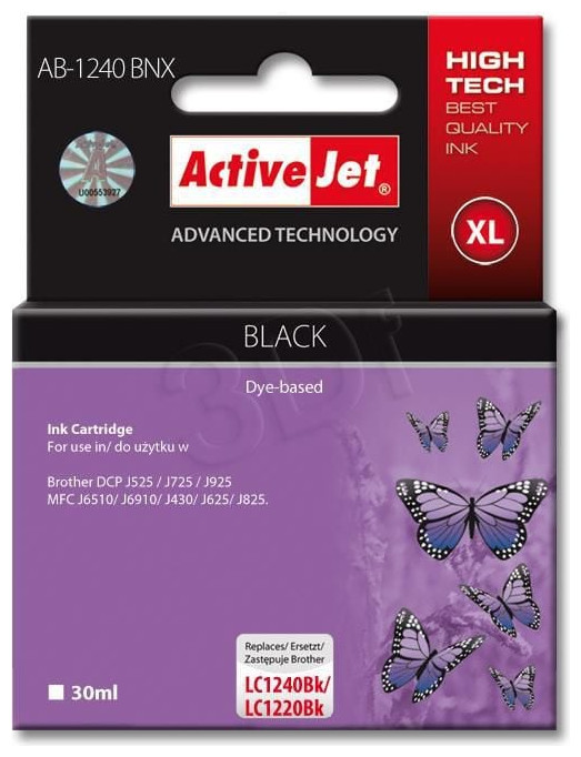 Τα δοχεία ActiveJet απευθύνονται σε πελάτες που αναμένουν την υψηλότερη ποιότητα εκτύπωσης. Χαρακτηρίζονται από αυξημένη χωρητικότητα σε σχέση με τα αυθεντικά προϊόντα και πιστή αναπαραγωγή του τύπου μελανιού. Όλα τα δοχεία υποβάλλονται σε πολυάριθμες δοκιμές σε κάθε στάδιο παραγωγής, γεγονός που εξαλείφει αποτελεσματικά τα ελαττώματα και εξασφαλίζει την ικανοποίηση της καλύτερης εκτύπωσης. Κασέτα μελάνης κορυφαίας έκδοσης, συμβατό με συσκευές εκτύπωσης Brother, αντικατάσταση για τα μοντέλα LC1220Bk, LC1240Bk, LC1280Bk. Το προϊόν περιέχει μελάνι μαύρης βαφής με αυξημένη χωρητικότητα 30 ml.{Dedicated model} Brother MFC-J6510DW . {Dedicated model} Brother MFC-J6510DW . {Dedicated model} Brother MFC-J6710DW . {Dedicated model} Brother MFC-J6710DW . {Dedicated model} Brother DCP-J525W . {Dedicated model} Brother DCP-J525W . {Dedicated model} Brother DCP-J725DW . {Dedicated model} Brother DCP-J725DW . {Dedicated model} Brother DCP-J925DW . {Dedicated model} Brother DCP-J925DW . {Dedicated model} Brother MFC-J430W . {Dedicated model} Brother MFC-J430W . {Dedicated model} Brother MFC-J625DW . {Dedicated model} Brother MFC-J625DW . {Dedicated model} Brother MFC-J825DW . {Dedicated model} Brother MFC-J825DW . {Χρώμα}Μαύρο. {Χρώμα}Μαύρο. Κασέτα {Type} . Κασέτα {Type} . Αντικατάσταση {Type} . Αντικατάσταση {Type}