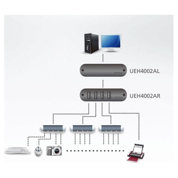 Το καλώδιο επέκτασης UEH4002A 4 θυρών USB 2.0 CAT 5 διαθέτει πατενταρισμένη τεχνολογία ExtremeUSB® που επιτρέπει στους χρήστες να υπερβούν το τυπικό όριο καλωδίων 5 μέτρων για περιφερειακά USB.