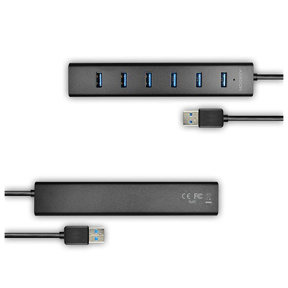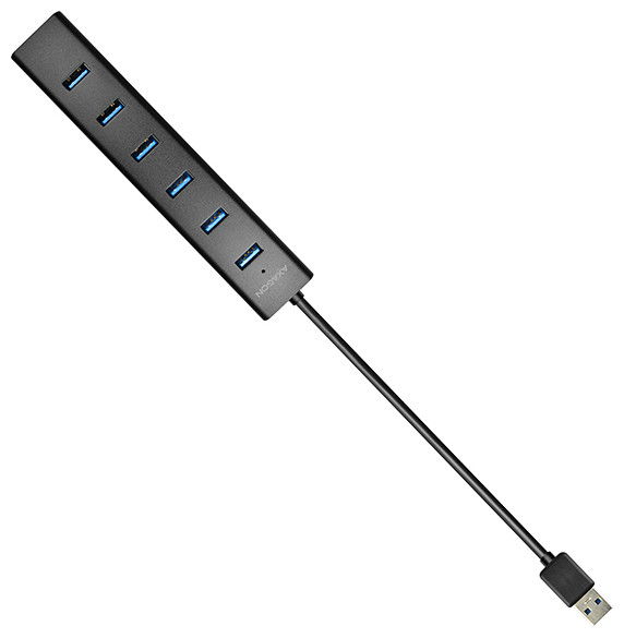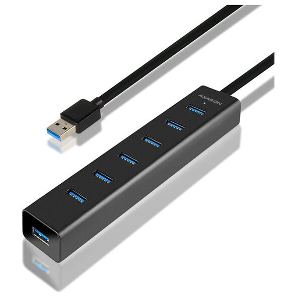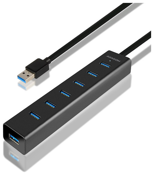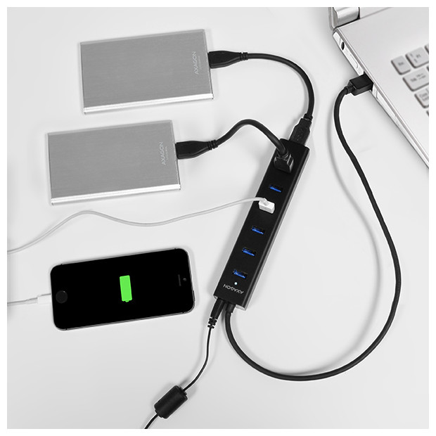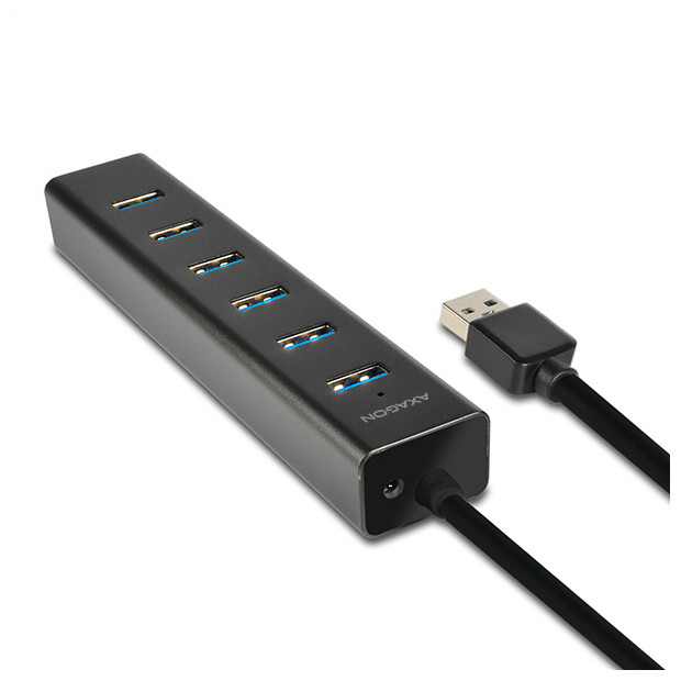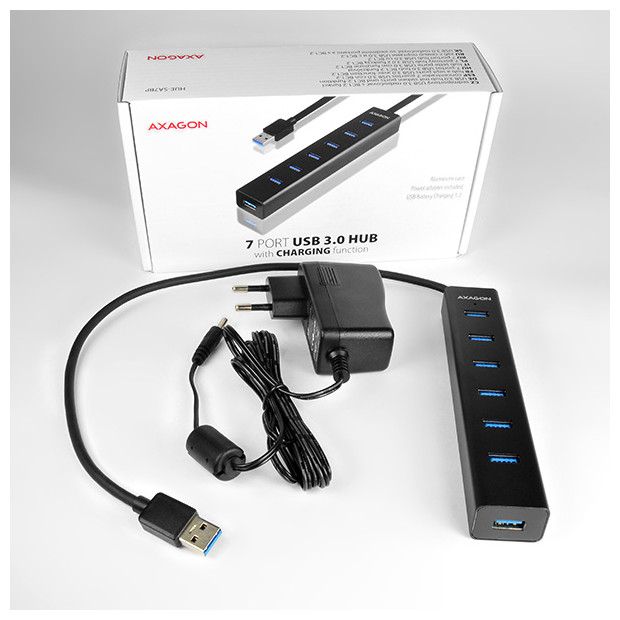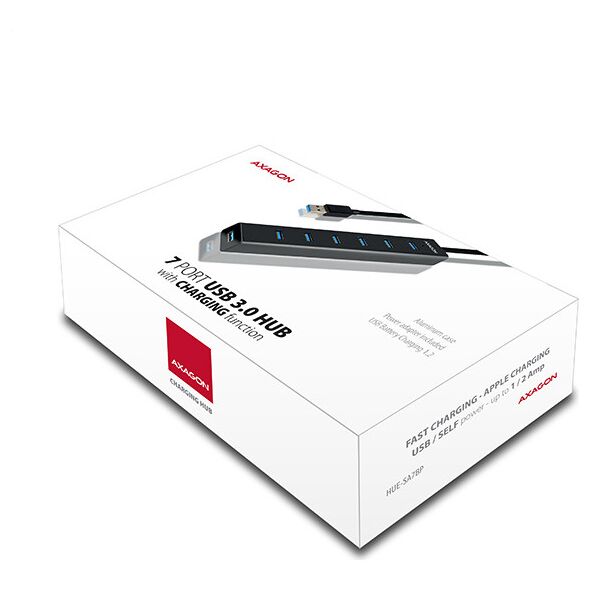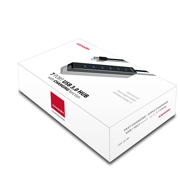 AXAGON HUE-SA7BP ALU CHARGING Διανομέας USB 3.0 7 θυρών με δικό του τροφοδοτικό και υποστήριξη γρήγορης φόρτισης σε όλες τις θύρες USB Ο συμπαγής διανομέας με ανθεκτικό περίβλημα αλουμινίου θα συνδέσει εύκολα και γρήγορα έως και επτά συσκευές USB στον υπολογιστή σας ταυτόχρονα. Τα κινητά τηλέφωνα, τα tablet (συμπεριλαμβανομένου του iPad), οι τράπεζες ισχύος και άλλες συσκευές μπορούν να φορτιστούν με ρεύμα έως και 2Α σε οποιαδήποτε θύρα του διανομέα, χάρη στην υποστήριξη της προδιαγραφής φόρτισης μπαταρίας USB. 1.2 Μπορεί ακόμη και να συνδέσει μόνιμα πολλές εξωτερικές μονάδες δίσκου ακόμη και χωρίς την παροχή ρεύματος του διανομέα. Με το δικό του τροφοδοτικό, μπορεί να συνδέσει έως και τέσσερις μαγνητικές εξωτερικές μονάδες 2,5". Θύρες USB τοποθετημένες απέναντι με επαρκή χώρο για άμεση, χωρίς προβλήματα σύνδεση συσκευών USB μεγάλου μεγέθους, μόνιμα συνδεδεμένο καλώδιο USB επαρκούς μήκους 40 cm, ιδανικό για χρήση με φορητούς υπολογιστές Φορτίστε συσκευές USB από το τροφοδοτικό ακόμα και όταν είναι απενεργοποιημένος ή αποσυνδεδεμένος. upstream θύρα USB 3.0 με αρσενικό βύσμα USB 3.0 τύπου A μόνιμα συνδεδεμένο σε καλώδιο μήκους 40 cm.• Συμβατό με USB 3.0, συμβατό με USB 2.0 και USB 1.1.• Υποστήριξη για ταχύτητες μετάδοσης 1,5 / 12 / 480 / 5000 Mbit/ s ( χαμηλή / πλήρης / υψηλή / σούπερ ταχύτητα).• Υποστήριξη φόρτισης μπαταρίας USB στις προδιαγραφές 1.2.• Κάθε θύρα του διανομέα μπορεί να χρησιμοποιηθεί για φόρτιση με έως και 2 A.• Δυνατότητα σύνδεσης της συσκευής ενώ λειτουργεί χάρη στην υποστήριξη Hot Plug.• Υποστήριξη Full Plug and Play.• LED που υποδεικνύει ότι ο διανομέας είναι συνδεδεμένος στο τροφοδοτικό.• Ανίχνευση και προστασία από υπερένταση.• Διαστάσεις Hub 156 x 30 x 21 mm, διαστάσεις προσαρμογέα AC 29 x 75 x 80 mm συμπεριλαμβανομένων των βυσμάτων 88 g (συμπεριλαμβανομένου του καλωδίου), βάρος μετασχηματιστή AC 100 g (συμπεριλαμβανομένου του καλωδίου Λειτουργία τροφοδοσίας Hub μέσω καλωδίου USB (τροφοδοσία λεωφορείου): • Η φόρτιση μέσω του διαύλου USB είναι αρκετή για τη σύνδεση μιας συσκευής USB με χαμηλή κατανάλωση ενέργειας (ποντίκι, πληκτρολόγιο). , συσκευή ανάγνωσης καρτών , pendrive, κ.λπ.) ή αυτοτροφοδοτούμενη (εκτυπωτής, σαρωτής, εξωτερική μονάδα δίσκου 3,5") και στις τέσσερις θύρες. • Διανομέας USB σε αυτήν τη λειτουργία τροφοδοσίας μπορεί να χειριστεί έως και 2 μαγνητικές εξωτερικές μονάδες 2,5" ταυτόχρονα, εάν συνδέσετε έως και τρεις μονάδες ταυτόχρονα. • Η τροφοδοσία φορητών συσκευών (συμπεριλαμβανομένου του iPad) είναι δυνατή σε αυτήν τη λειτουργία τροφοδοσίας, αλλά το ρεύμα τροφοδοσίας φτάνει μόνο τα 0,9 A. Η λειτουργία τροφοδοσίας του ίδιου του διανομέα από το περιλαμβανόμενος μετασχηματιστής ρεύματος (αυτοτροφοδοσία): • Δική του τροφοδοσία μέσω του παρεχόμενου μετασχηματιστή AC/DC (είσοδος: 100-240V~, 50/60Hz, 0,45A, Έξοδος: 5V-2A / 10W, βύσμα Euro δύο ακίδων, ομοαξονική υποδοχή εξόδου με διάμετρο 3,5/1,3 mm, καλώδιο 150 cm).• Ο διανομέας USB σε αυτή τη λειτουργία τροφοδοσίας μπορεί να χειριστεί 4 εξωτερικές μαγνητικές μονάδες 2,5". Ωστόσο, για αξιόπιστη μακροχρόνια λειτουργία του διανομέα, συνιστούμε τη σύνδεση έως και 3 εξωτερικών μονάδων δίσκου 2,5" ταυτόχρονα. • Γρήγορη φόρτιση φορητών συσκευών (συμπεριλαμβανομένου του iPad) με ρεύμα έως και 2Α σε κάθε θύρα διανομέα. Το συνολικό ρεύμα που παρέχεται από τον διανομέα κατά τη φόρτιση περιορίζεται από το ρεύμα εξόδου του εξωτερικού μετασχηματιστή ρεύματος στο μέγιστο 2A. , ο κόμβος λειτουργεί με τροφοδοτείται από τ