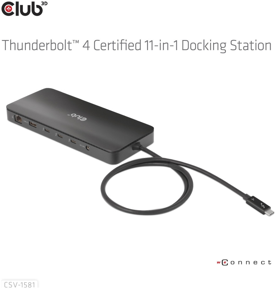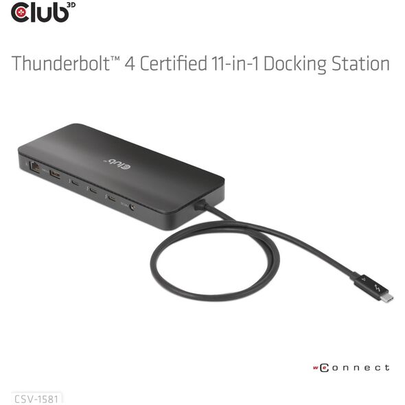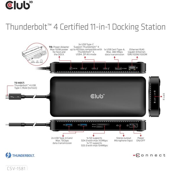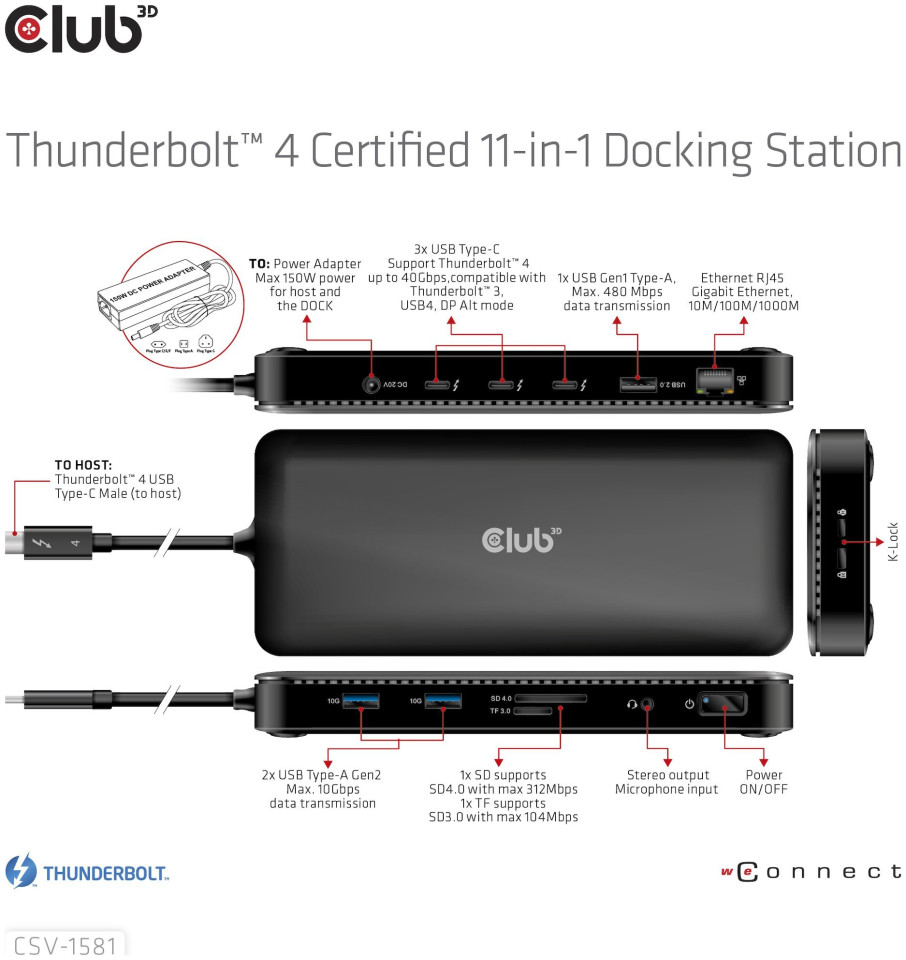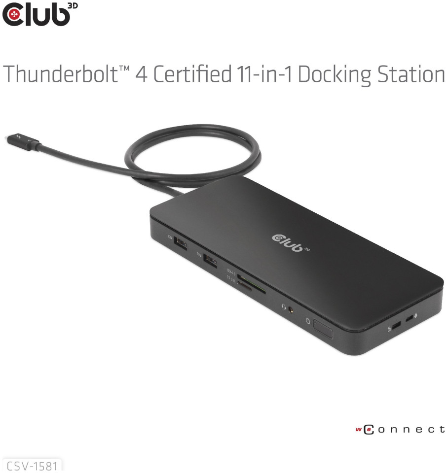 CLUB3D CSV-1581. Τεχνολογία συνδεσιμότητας: Docking, Διασύνδεση κεντρικού υπολογιστή: Thunderbolt 4, Μέγιστη τροφοδοσία USB: 140 W. Ταχύτητα μεταφοράς δεδομένων μέσω LAN Ethernet: 1000 Mbit/s. Χρώμα προϊόντος: Μαύρο, Υποστηριζόμενοι τύποι καρτών μνήμης: SD