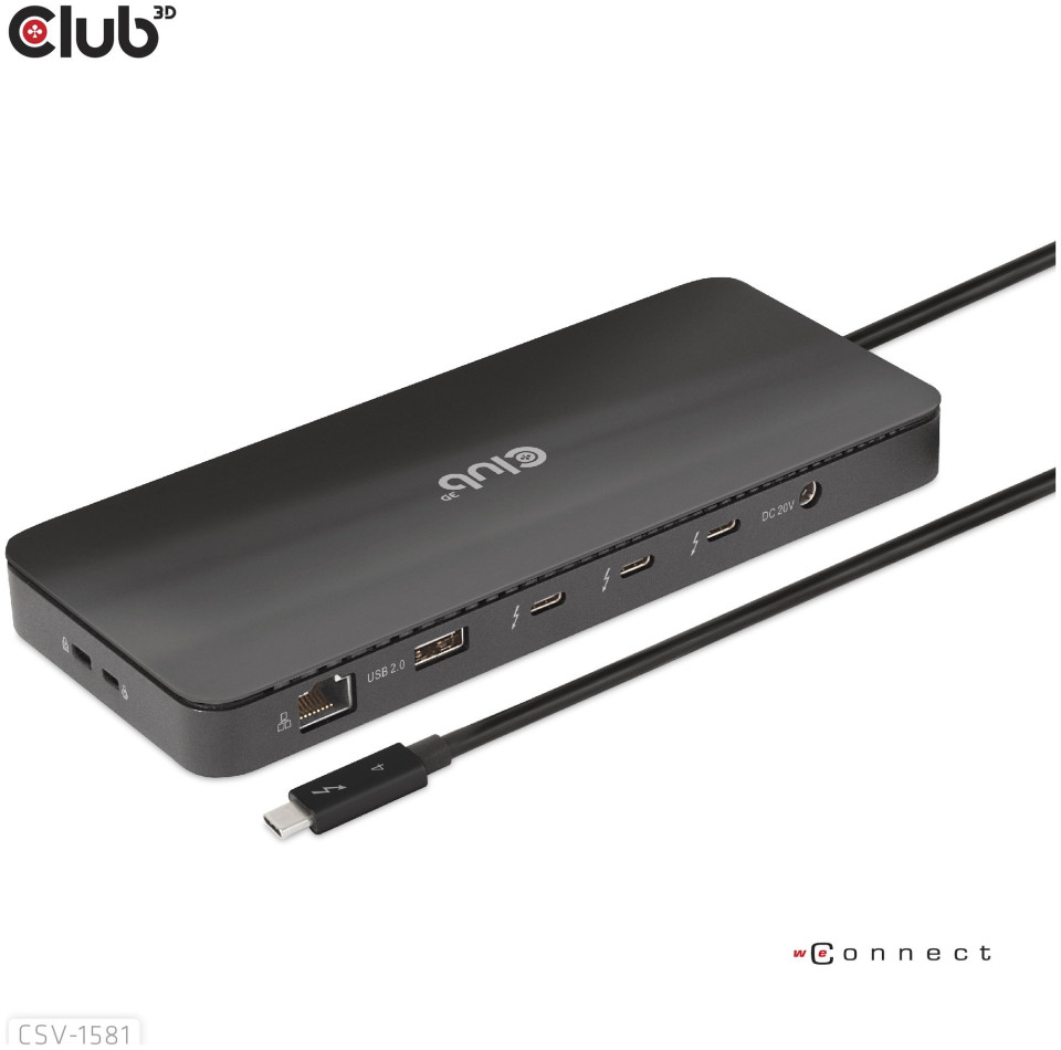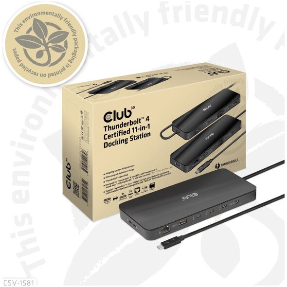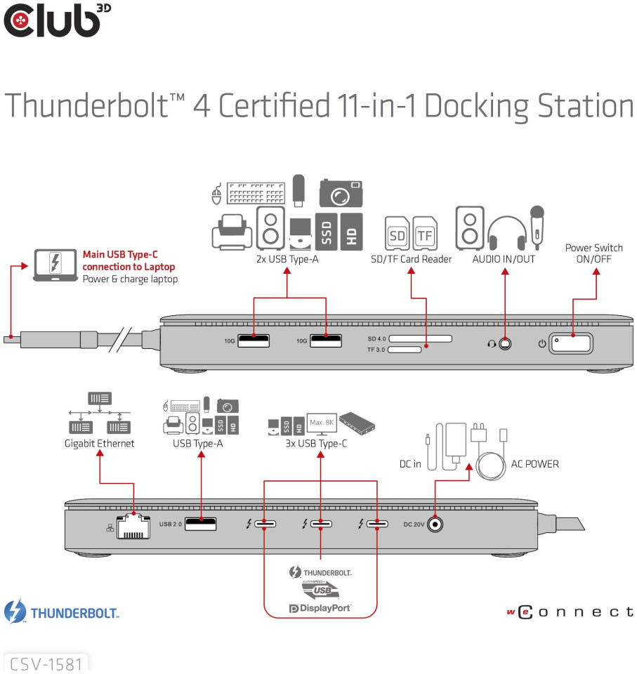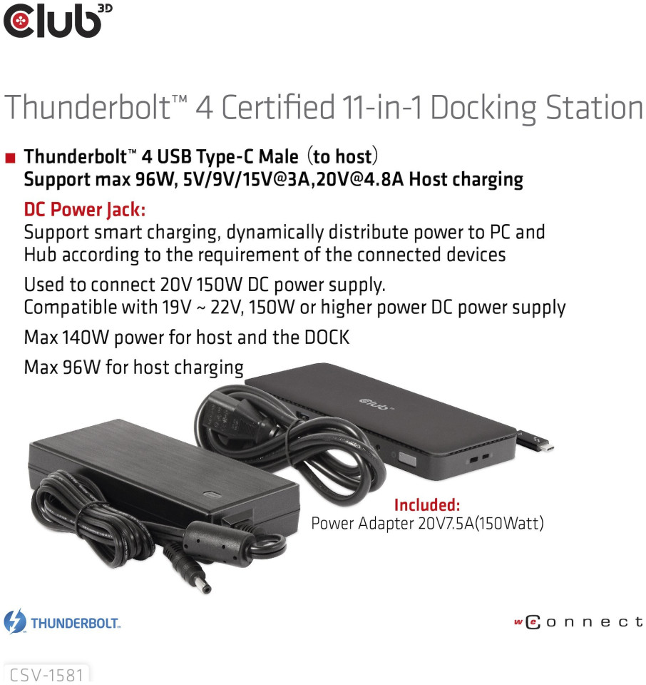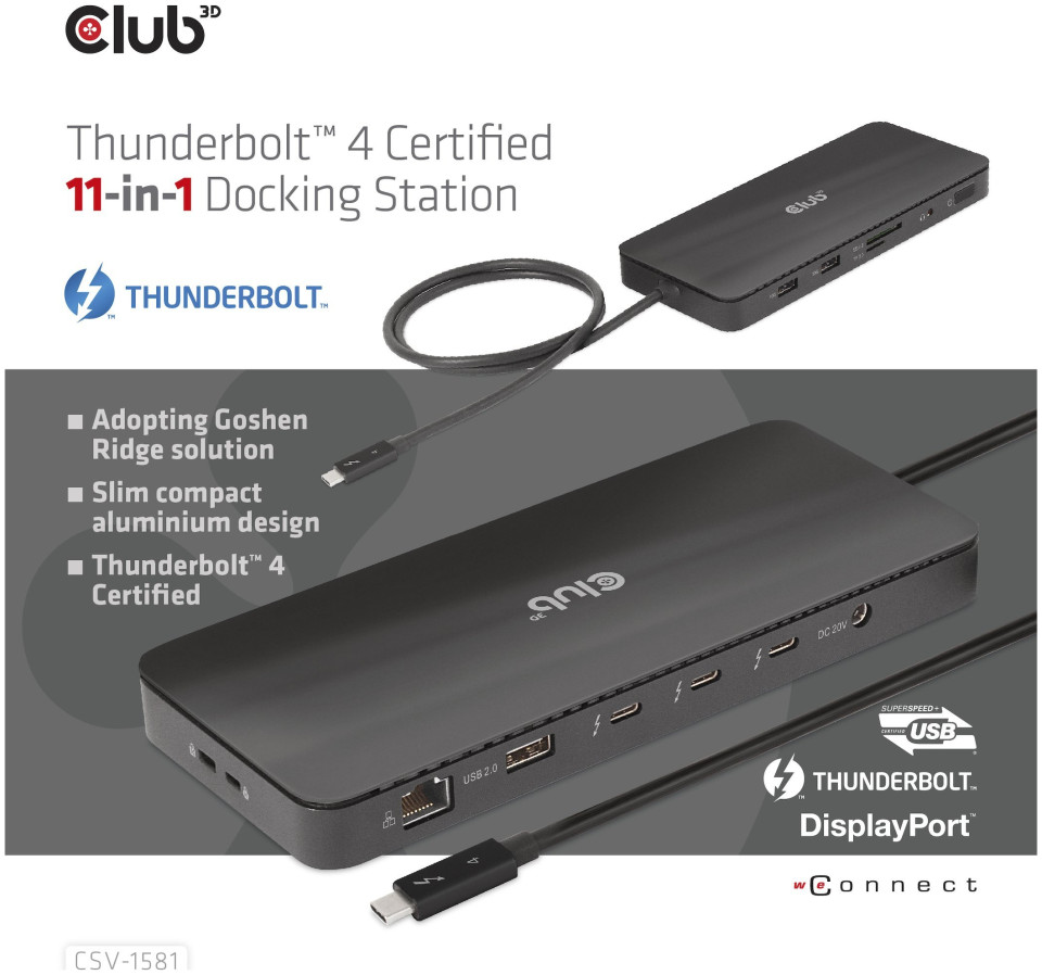 CLUB3D CSV-1581. Τεχνολογία συνδεσιμότητας: Docking, Διασύνδεση κεντρικού υπολογιστή: Thunderbolt 4, Μέγιστη τροφοδοσία USB: 140 W. Ταχύτητα μεταφοράς δεδομένων μέσω LAN Ethernet: 1000 Mbit/s. Χρώμα προϊόντος: Μαύρο, Υποστηριζόμενοι τύποι καρτών μνήμης: SD