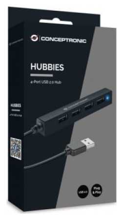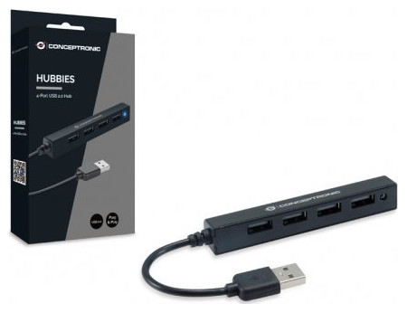 Conceptronic HUBBIES05B. Διεπαφή κεντρικού υπολογιστή: USB 2.0, Διασυνδέσεις Hub: USB 2.0. Πραγματικός ρυθμός μεταφοράς δεδομένων: 480 Mbit/s, Χρώμα προϊόντος: Μαύρο, Μήκος καλωδίου: 0,09 m Τύπος τροφοδοσίας: USB. Πλάτος προϊόντος: 15 mm, Βάθος προϊόντος: 96 mm, Ύψος προϊόντος: 15 mm. Πλάτος συσκευασίας: 90 mm, Βάθος συσκευασίας: 25 mm, Ύψος συσκευασίας: 180 mm