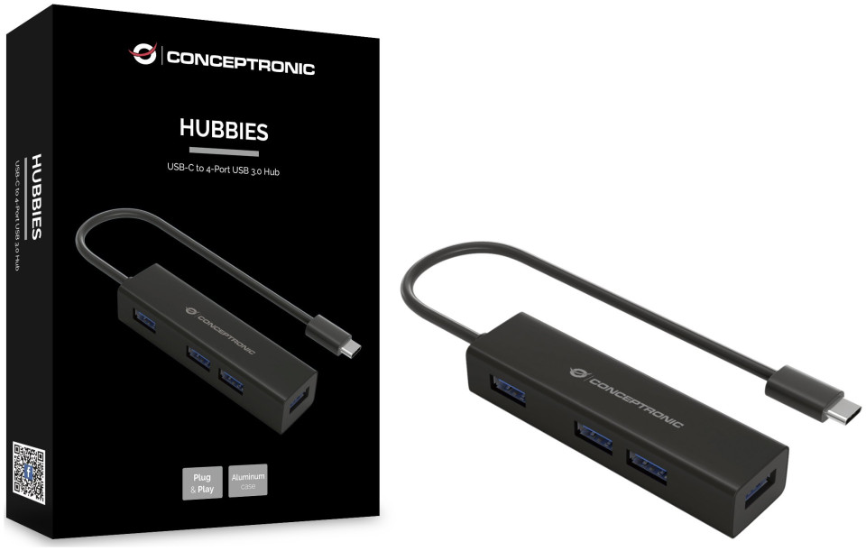 Conceptronic HUBBIES07B. Διεπαφή κεντρικού υπολογιστή: USB 3.2 Gen 1 (3.1 Gen 1) Type-C, Διασυνδέσεις Hub: USB 3.2 Gen 1 (3.1 Gen 1) Type-A. Πραγματικός ρυθμός μεταφοράς δεδομένων: 5000 Mbit/s, Χρώμα προϊόντος: Μαύρο, Υλικό περιβλήματος: Αλουμίνιο. Πλάτος προϊόντος: 87,5 mm, Βάθος προϊόντος: 23,4 mm, Ύψος προϊόντος: 16,5 mm. Ποσότητα ανά συσκευασία: 1 τεμ., Πλάτος συσκευασίας: 112,5 mm, Βάθος συσκευασίας: 24,5 mm
