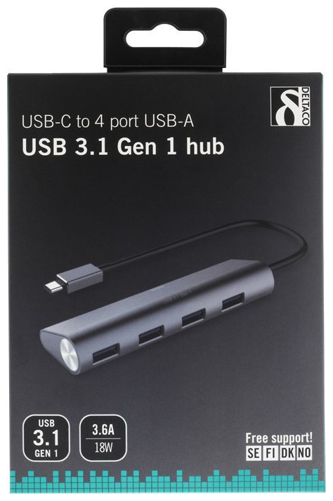 USB HUB Deltaco USB-C διανομέας DELTACO 18W 3.6A, USB 3.1, 1xUSBC, 4xUSB-A, μαύρο / USBC-1207