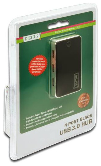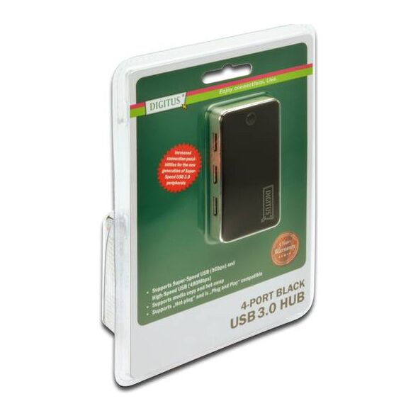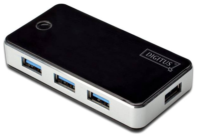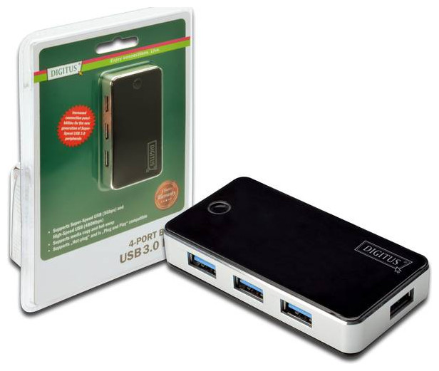 Ο διανομέας USB 3.0 4 θυρών DIGITUS σάς επιτρέπει να συνδέετε ταυτόχρονα έως και τέσσερις συσκευές USB σε υπολογιστή ή Mac. Συνδέστε τις αγαπημένες σας συσκευές και απολαύστε υψηλής ταχύτητας 3.0 (έως και 10 φορές ταχύτερα από το USB 2.0). Αυτό το προϊόν εντυπωσιάζει με τον καθαρό και κομψό σχεδιασμό του με γυαλιστερό μαύρο επάνω και κάτω μέρος και αλουμινένια άκρη.