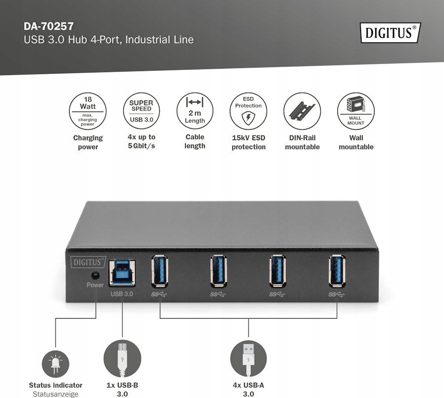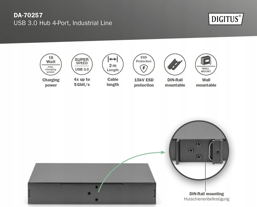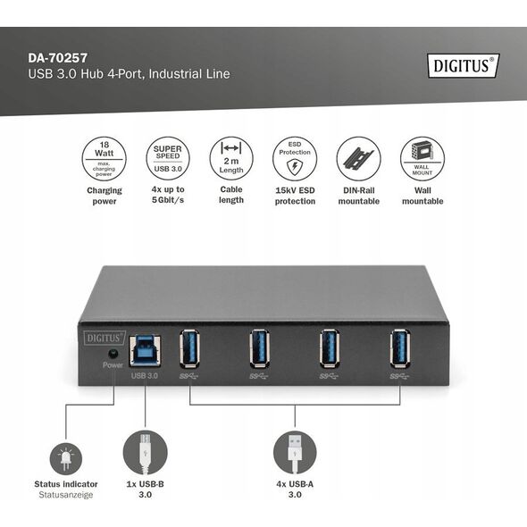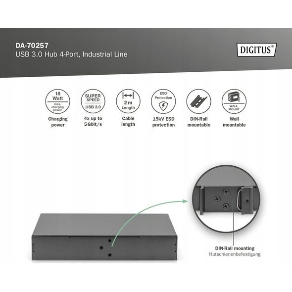 ✔️ Digitus USB 3.0 Hub, 4-port, Industrial Line ✔️ Η λύση επεκτείνει τις δυνατότητες ενός υπολογιστή εξοπλισμένου με θύρα USB-A με 4 επιπλέον θύρες USB-A Super-Speed. - Επιπλέον, 4 υποδοχές USB A 3.0 με εύρος ζώνης έως και 5 Gbps στη θύρα USB A ή USB-C - Το στιβαρό μεταλλικό περίβλημα και οι διάφοροι βραχίονες στήριξης επιτρέπουν ευέλικτη εγκατάσταση σε ράγες στήριξης ή διάφορες επιφάνειες - Προστασία ESD έως 15 kV : Ο διανομέας USB προστατεύεται από ηλεκτροστατική εκφόρτιση, επομένως είναι ιδιαίτερα κατάλληλος για χρήση σε βιομηχανικά περιβάλλοντα. - Χάρη στο πρότυπο Super-Speed USB 3.0, είναι δυνατή η γρήγορη μεταφορά δεδομένων έως και 5 Gbps. Επιπλέον, οι συνδέσεις USB 2.0 και USB 1.1 υποστηρίζονται χάρη στη συμβατότητα προς τα πίσω - Συμβατό με πολλαπλά λειτουργικά συστήματα, π.χ. macOS, Windows και Google Chrome OS Ο βιομηχανικός διανομέας USB 3.0 είναι ιδανικός για βιομηχανικές εφαρμογές χάρη στο μεταλλικό περίβλημά του. Μπορεί να τοποθετηθεί σε τοίχο ή σε ράγα στήριξης και να συνδεθεί σε υπολογιστή, φορητό υπολογιστή ή διακομιστή χρησιμοποιώντας το παρεχόμενο καλώδιο USB 3.0. Ο διανομέας υποστηρίζει το πρότυπο υπερταχύτητας USB 3.0 με ρυθμό μεταφοράς δεδομένων έως και 5 Gbit/s και είναι συμβατός με USB 2.0 και USB 1.1. Ο συγκεντρωτής μπορεί να τροφοδοτηθεί μέσω μιας σύνδεσης μπλοκ ακροδεκτών δύο καλωδίων (+9V έως 24V). Προαιρετικά, μπορεί να συνδεθεί εξωτερικό τροφοδοτικό στην υποδοχή DC. ✏️ Οι πιο σημαντικές τεχνικές παράμετροι: Απόδοση - Πραγματικός ρυθμός μεταφοράς δεδομένων: 5000 Mbit/s Απόδοση - Διεπαφές Hub: USB 3.2 Gen 1 (3.1 Gen 1) Type-A Κατασκευή - Χρώμα προϊόντος: Μαύρη Κατασκευή - LED: Τροφοδοτικό Κατασκευή - Περίβλημα υλικό: Μεταλλικές θύρες και διεπαφές - Διεπαφή κεντρικού υπολογιστή: USB 3.2 Gen 1 (3.1 Gen 1) Θύρες και διεπαφές τύπου Β - Αριθμός USB 3.2 Gen 1 (3.1 Gen 1) Θύρες Τύπος Α: 5 Θύρες και Διεπαφές - Αποκλεισμός θυρών τερματικού: Ναι Θύρες και διεπαφές - Αριθμός συνδέσεων (εσωτερικές/εξωτερικές): 4 θύρες και Διεπαφές - Υποδοχή εξόδου DC: Ναι Ισχύς - Μέγιστη κατανάλωση ισχύος: 18 W Τροφοδοσία - Τύπος τροφοδοσίας: Ρεύμα DC - Τάση λειτουργίας: 5 V Ισχύς - Ρεύμα εξόδου: 3,6 A Βάρος και διαστάσεις - Πλάτος προϊόντος: 69 mm Βάρος και διαστάσεις - Βάθος προϊόντος: 139 mm Βάρος και διαστάσεις - Ύψος προϊόντος: 25 mm Βάρος και διαστάσεις - Βάρος προϊόντος: 285 g Βάρος και διαστάσεις - Βάθος συσκευασίας: 140 mm Βάρος και διαστάσεις - Τύπος συσκευασίας: Χαρακτηριστικά κουτιού - Ποσότητα ανά συσκευασία: 1 τεμ. Χαρακτηριστικά -. Προστασία από υπέρταση τάσης: Ναι Χαρακτηριστικά - Υποστήριξη Plug & Play: Ναι Χαρακτηριστικά - Τάση: 9 - 24V Χαρακτηριστικά - Χώρα προέλευσης: Κίνα Χαρακτηριστικά - Δυνατότητα φόρτισης μπαταρίας: Ναι Χαρακτηριστικά - Αναθεώρηση φόρτισης μπαταρίας: 1.2 Συνθήκες λειτουργίας - Μέγιστη θερμοκρασία λειτουργίας: 40 ° C Στοιχεία συσκευασίας - Καλώδια: USB τύπου A σε USB τύπου B Περιεχόμενα συσκευασίας - Κιτ επιτοίχιας τοποθέτησης: Ναι Λεπτομέρειες συσκευασίας - Βάρος συσκευασίας: 586 g Δεδομένα συσκευασίας - Περιλαμβάνεται λωρίδα: Ναι Περιεχόμενα συσκευασίας - Συμπεριλαμβάνεται Din rail: Ναι Στοιχεία συσκευασίας - Χωρητικότητα συσκευασίας: 1309 cm³ Δεδομένα εφοδιαστικής - Μάσκα με σειριακό αριθμό: 84718000 Ταξινόμηση - Κωδικός κατασκευαστή: Ταξινόμηση - EAN: 40105147403