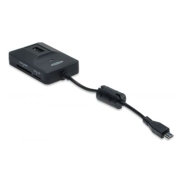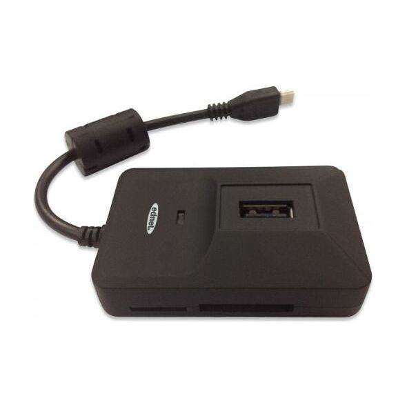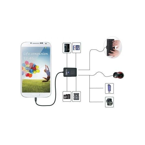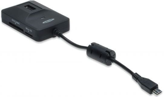 Czytnik kart oraz hub USB z funkcją OTG umożliwiający bezpośrednie podłączenie nośników danych (np. pendrive, karta pamięci) oraz klawiatury i myszki do smartphona lub tableta.- Dzięki temu urządzeniu w łatwy sposób możesz wymieniać dane pomiędzy urządzeniami oraz sterować tabletem lub smartfonem za pomocą myszki i klawiatury.- Kabel ze złączem microUSB wyposażony jest w filtr ferrytowy gwarantujący przesyłanie sygnału pozbawionego jakichkolwiek zakłóceń.- Możliwość stosowania ze wszystkimi smartphonami i tabletami z systemem Android obsługującymi funkcję OTGCzytnik kart: Micro SD, MS, SD, SDHC, MMC, MMC 2, RS MMC, Ultra 2 SD, Extreme SD, Extreme 3 SD