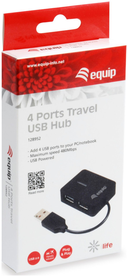 Αυτός ο διανομέας USB 2.0 τεσσάρων θυρών παρέχει στον υπολογιστή ή τον φορητό υπολογιστή σας πρόσθετες θύρες USB 2.0. Όλες οι θύρες μπορούν να χρησιμοποιηθούν ταυτόχρονα, επειδή η κατανάλωση ενέργειας καθορίζεται για κάθε θύρα ξεχωριστά. Χάρη στον συμπαγή σχεδιασμό του, αποτελεί ιδανική λύση για ταξίδια: