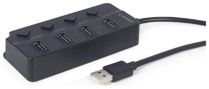 Gembird Hub USB 2.0 4-Port with Switches Διανομέας USB 4 θυρών με ενσωματωμένο καλώδιο USB σε ένα συμπαγές περίβλημα. Μπορεί να τροφοδοτηθεί από πρίζα DC για συσκευές που απαιτούν περισσότερη τροφοδοσία (δεν περιλαμβάνεται ο μετασχηματιστής ρεύματος.) Διαθέτει πρακτικά κουμπιά ενεργοποίησης/απενεργοποίησης και ενδείξεις κατάστασης LED.{Χρώμα}Μαύρο