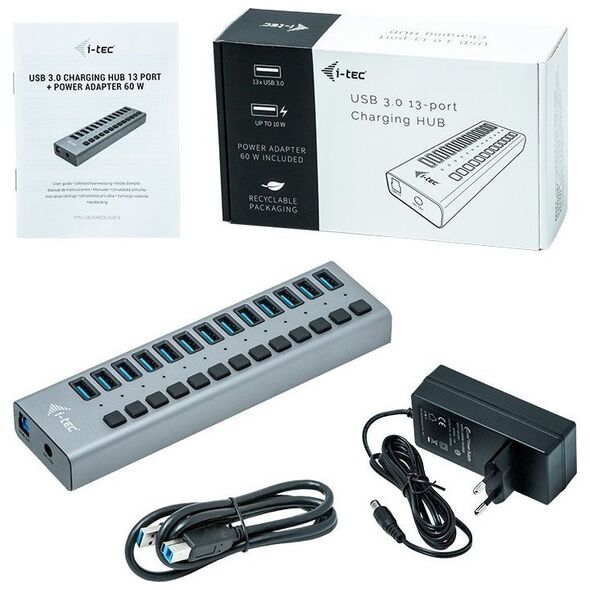Το HUB μας προσφέρει δεκατρείς θύρες USB 3.0 με λειτουργία Plug & Play και τυπική φόρτιση USB - ανιχνεύει αυτόματα εάν μια συσκευή USB είναι συνδεδεμένη για φόρτιση. Δεδομένου ότι το HUB είναι εξοπλισμένο με δεκατρείς θύρες USB 3.0, μπορεί να φορτίσει έως και δεκατρείς συσκευές ταυτόχρονα. Η διεπαφή USB 3.0 είναι ιδιαίτερα σημαντική για τη μεταφορά δεδομένων από κάρτες μνήμης USB 3.0 και μονάδες flash, όπου οι υψηλές ταχύτητες μεταφοράς είναι πιο χρήσιμες. Περιλαμβάνεται εξωτερικό τροφοδοτικό για να εγγυάται σταθερή απόδοση και φόρτιση από τις θύρες USB, παρέχοντας έως και 10 W ισχύος φόρτισης για κάθε θύρα.{Additional ports} Καμία . {Additional ports} Καμία . {Type} Ενεργό . {Type} Ενεργό . {Χρώμα} Ασημί . {Χρώμα} Ασημί . {Αριθμός θυρών USB-A} 13 . {Αριθμός θυρών USB-A} 13 . {Type} Standard . {Type} Standard . {Πλάτος} 53 χλστ. {Πλάτος} 53 χλστ. {Ταχύτητα μετάδοσης δεδομένων} 5 Gb/s. {Ταχύτητα μετάδοσης δεδομένων} 5 Gb/s. {Πρότυπη θύρα USB} 3.0. {Πρότυπη θύρα USB} 3.0. {Plug}USB-A . {Plug}USB-A . {Μήκος} 187 mm . {Μήκος} 187 mm . {Ύψος} 24 mm. {Ύψος} 24 mm