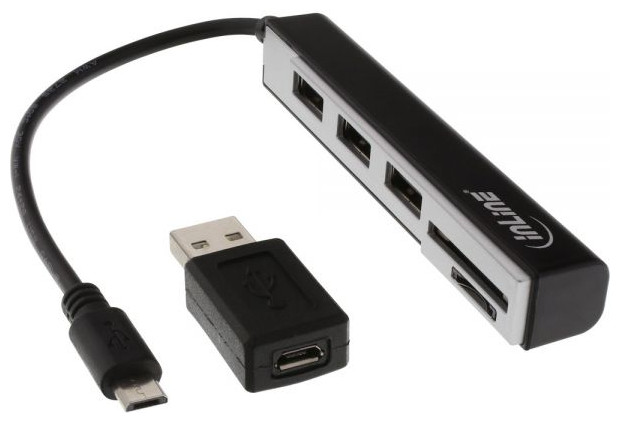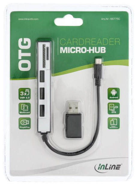 Τεχνικά δεδομένα: Όνομα προϊόντος: InLine USB OTG Card reader & 3 Port USB 2.0 Hub for SDXC & microSD + adapter Προβλεπόμενη χρήση: smartphone και tablet με υποστήριξη OTG και θύρα microUSB Διεπαφή: microUSB B-plug Μέγιστη μεταφορά δεδομένων: έως 480 MB/ s Chipset: FE1 1s + MA8170 Υποστήριξη Android 4.0 ή νεότερη έκδοση Υλικό: Πλαστικό ABS Βάρος: 20 g Διαστάσεις: 98 x 17 x 17 mm Περιλαμβάνεται: Προσαρμογέας USB A σε microUSB B για σύνδεση της συσκευής με υπολογιστή Συμβατές κάρτες μνήμης: SD, SDHC, SDXC, microSD, microSDHC, microSDXC και παρόμοιες παραλλαγές{Type} Παθητικό . {Type} Παθητικό . {Αριθμός θυρών USB-A} 3 . {Αριθμός θυρών USB-A} 3 . {Additional ports} 1x SD . {Additional ports} 1x SD . {Μήκος} 98 mm. {Μήκος} 98 mm. {Additional ports} 1x microSD . {Additional ports} 1x microSD . {Type} Standard . {Type} Standard . {Ταχύτητα μετάδοσης δεδομένων} 480 Mbps. {Ταχύτητα μετάδοσης δεδομένων} 480 Mbps. {Χρώμα} Μαύρο. {Χρώμα} Μαύρο. {Πρότυπη θύρα USB} 2.0 . {Πρότυπη θύρα USB} 2.0 . {Plug} microUSB OSG / USB A. {Plug} microUSB OSG / USB A. {Πλάτος} 17 mm. {Πλάτος} 17 mm. {Ύψος} 17 mm . {Ύψος} 17 mm
