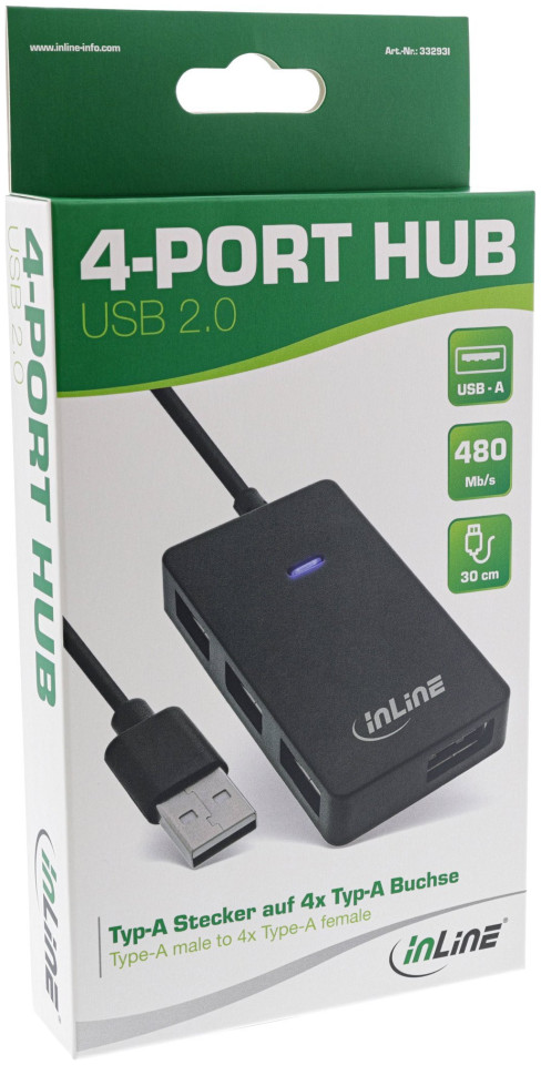InLine 33293I. Διεπαφή κεντρικού υπολογιστή: USB 3.2 Gen 1 (3.1 Gen 1) Type-A, Διασυνδέσεις Hub: USB 2.0. Πραγματικός ρυθμός μεταφοράς δεδομένων: 480 Mbit/s, Χρώμα προϊόντος: Μαύρο, Υλικό περιβλήματος: Πλαστικό. Ποσότητα ανά συσκευασία: 1 τεμ.