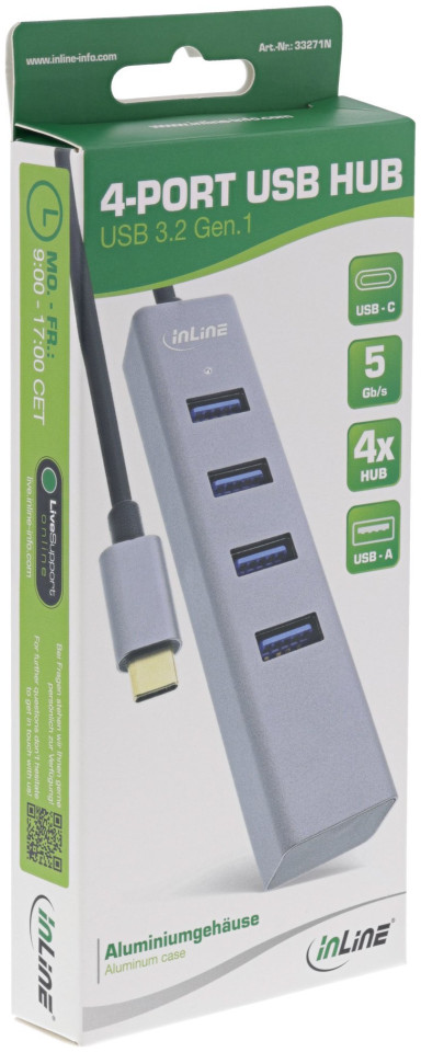 InLine 33271N. Διεπαφή κεντρικού υπολογιστή: USB 2.0 Type-C, Διασυνδέσεις Hub: USB 3.2 Gen 1 (3.1 Gen 1) Type-A. Πραγματικός ρυθμός μεταφοράς δεδομένων: 5000 Mbit/s, Χρώμα προϊόντος: Ασημί, Υλικό περιβλήματος: Αλουμίνιο. Τύπος τροφοδοσίας: USB. Άλλα υποστηριζόμενα λειτουργικά συστήματα: Android. Ποσότητα ανά συσκευασία: 1 τεμ., Τύπος συσκευασίας: Κρεμαστό κουτί