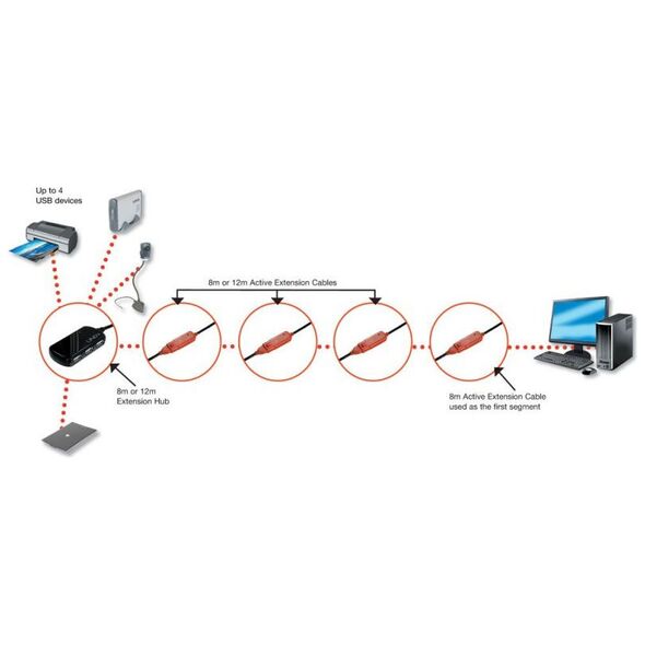 Το προϊόν λειτουργεί σε συνδυασμό με ένα ενεργό καλώδιο επέκτασης 8 μέτρων ή ένα καλώδιο ενεργής επέκτασης 12 μέτρων για τη δημιουργία σύνδεσης USB 2.0 έως 56 μέτρα με 4 θύρες USB 2.0 και ένα τηλεχειριστήριο στο τέλος.
