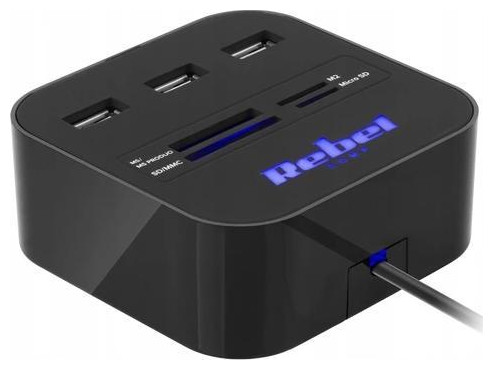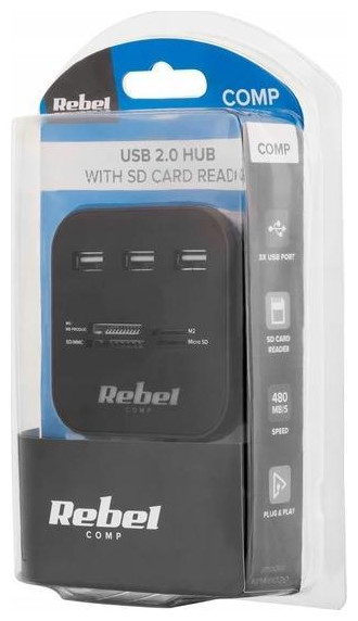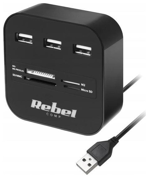 Klawiatura, myszka, modem internetowy, pamięć zewnętrzna… Czasami liczba portów USB, w jakie został wyposażony komputer czy laptop nie jest wystarczająco duża. Wtedy z pomocą przychodzi hub USB z serii Rebel Comp, który pozwoli Ci uzyskać 2 dodatkowe porty. Posiada interfejs 2.0, który umożliwia transfer danych z prędkością do 480 Mb/s i choć wygląda niepozornie, potrafi znacznie rozszerzyć funkcjonalność urządzenia, na jakim pracujesz. Co ważne, to akcesorium to nie tylko rozdzielacz USB. Może ono także posłużyć jako zewnętrzny czytnik kart pamięci USB, który umożliwia szybki dostęp do danych zapisanych na większości typów kart.