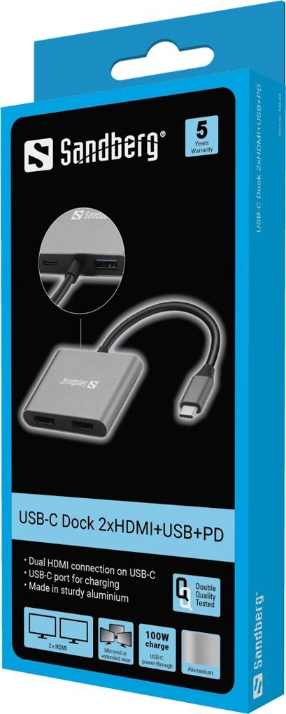 ✔️ Sandberg 136-44 huby i koncentratory USB 3.2 Gen 1 (3.1 Gen 1) Type-C Szary ✔️Ta niezwykle poręczna stacja dokująca USB-C umożliwia podłączenie dwóch dodatkowych monitorów za pomocą złączy HDMI. Posiada także tradycyjne gniazdo USB-A do podłączania na przykład myszy lub pamięci zewnętrznej, a także złącze zasilające USB-C PD, które pozwala zasilać laptopa. ✏️ Najważniejsze parametry techniczne: Wyświetlacz - Typ HD: 4K Ultra HD Sieć - Liczba połączeń (wewnętrznych/zewnętrznych): 4 Konstrukcja - Kolor produktu: Szary Konstrukcja - Materiał obudowy: Aluminium Porty i interfejsy - Interfejs hosta: USB 3.2 Gen 1 (3.1 Gen 1) Type-C Porty i interfejsy - Maksymalne zasilanie USB: 100 W Porty i interfejsy - Interfejsy hub: HDMI, USB 3.2 Gen 1 (3.1 Gen 1) Type-A, USB 3.2 Gen 1 (3.1 Gen 1) Type-C Porty i interfejsy - Ilość portów USB 3.2 Gen 1 (3.1 Gen 1) Typu-A: 1 Porty i interfejsy - Ilość portów USB 3.2 Gen 1 (3.1 Gen 1) Typu-C: 1 Porty i interfejsy - Ilość portów HDMI: 2 Porty i interfejsy - Zasilanie USB: Tak Wydajność - Maksymalna rozdzielczość (HDMI): 3840 x 2160 px Wymagania systemowe - Obsługiwane systemy operacyjne Windows: Windows 10, Windows 11 Waga i rozmiary - Szerokość produktu: 60 mm Waga i rozmiary - Wysokość produktu: 12 mm Waga i rozmiary - Głębokość produktu: 60 mm Waga i rozmiary - Ilość na paczkę: 1 szt. Dane opakowania - Głębokość opakowania: 27 mm Dane opakowania - Waga wraz z opakowaniem: 70 g Klasyfikacja - Kod producenta: 136-44 Klasyfikacja - EAN: 5705730136443 Klasyfikacja - ID Produktu: 99546927