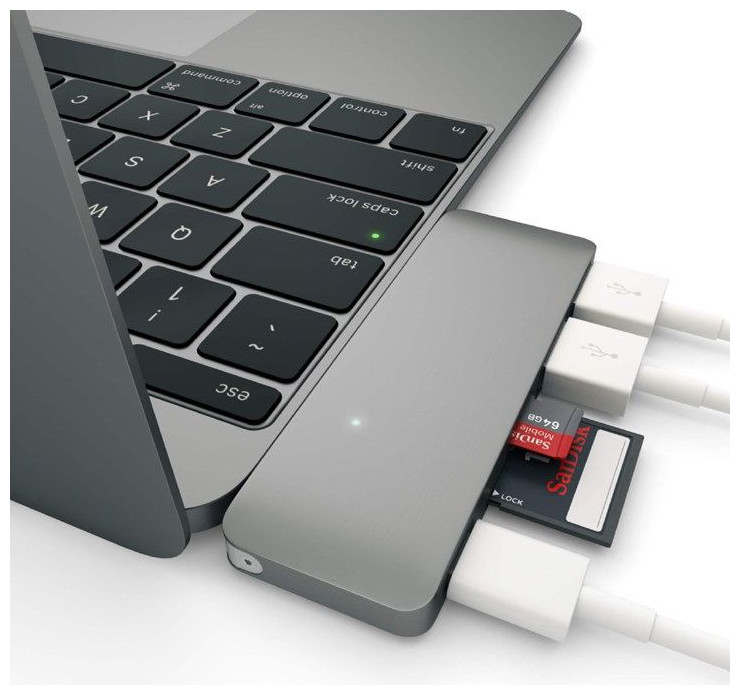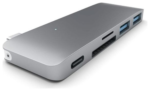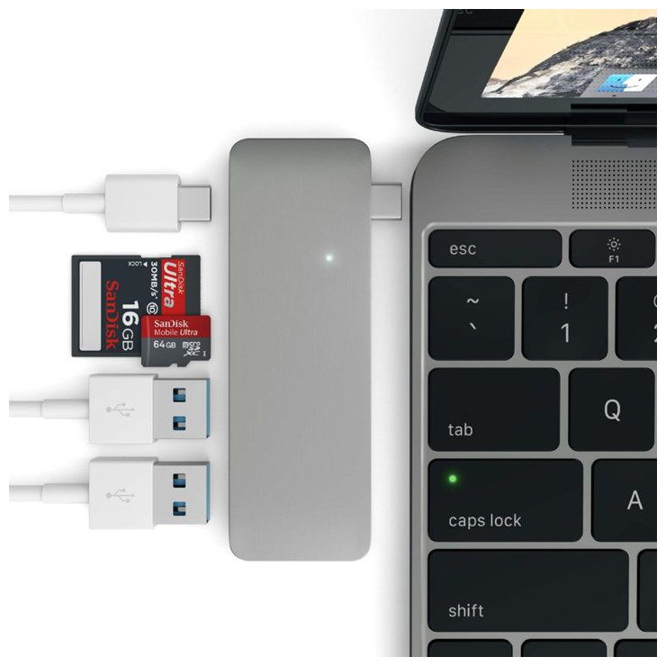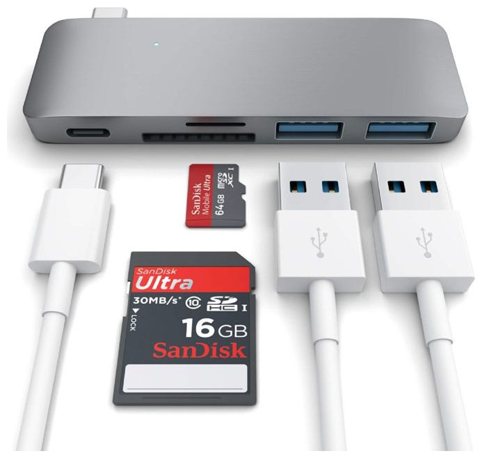 Hub z interfejsem USB-C. Posiada 2 porty USB 3.0, 1 port USB-C oraz slot kart pamięci SD i microSD. UWAGA: slot kart SD oraz microSD nie mogą być używane w tym samym czasie.
