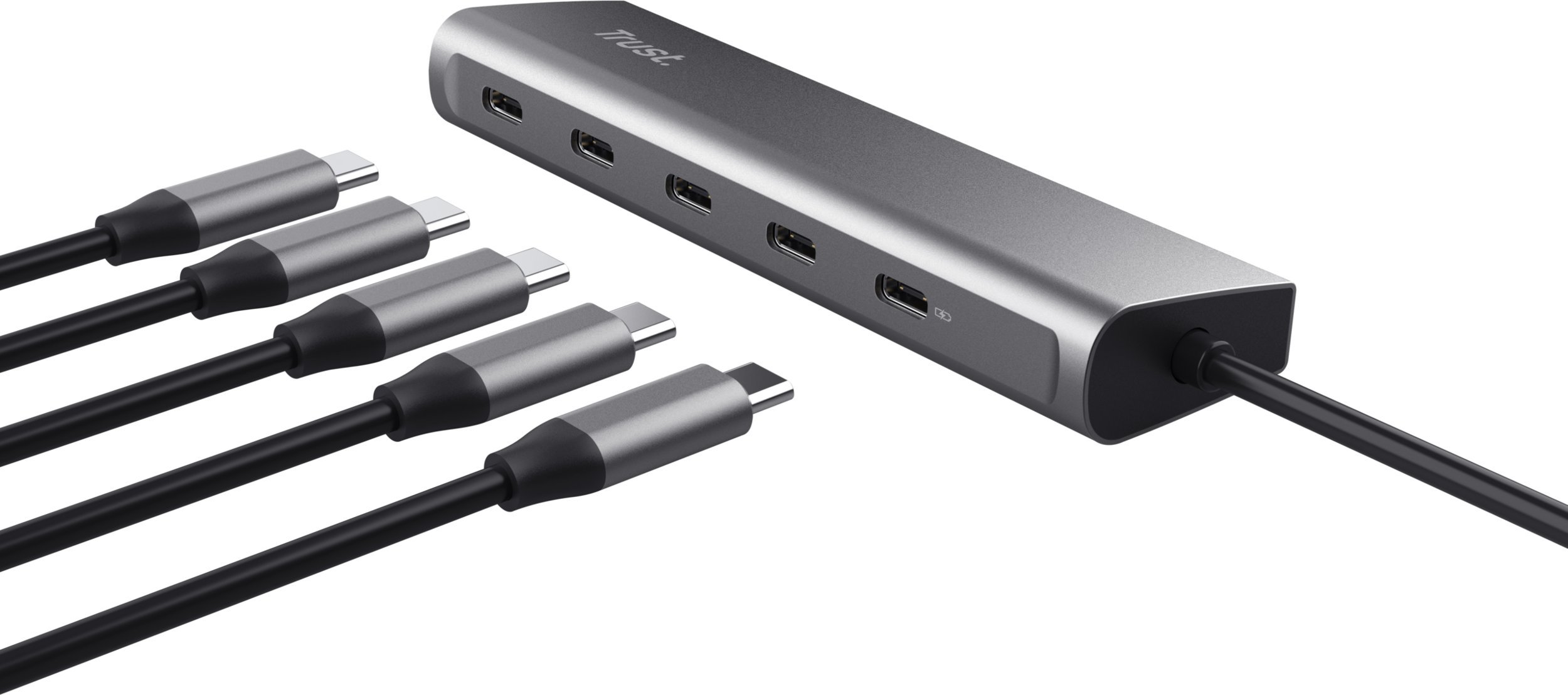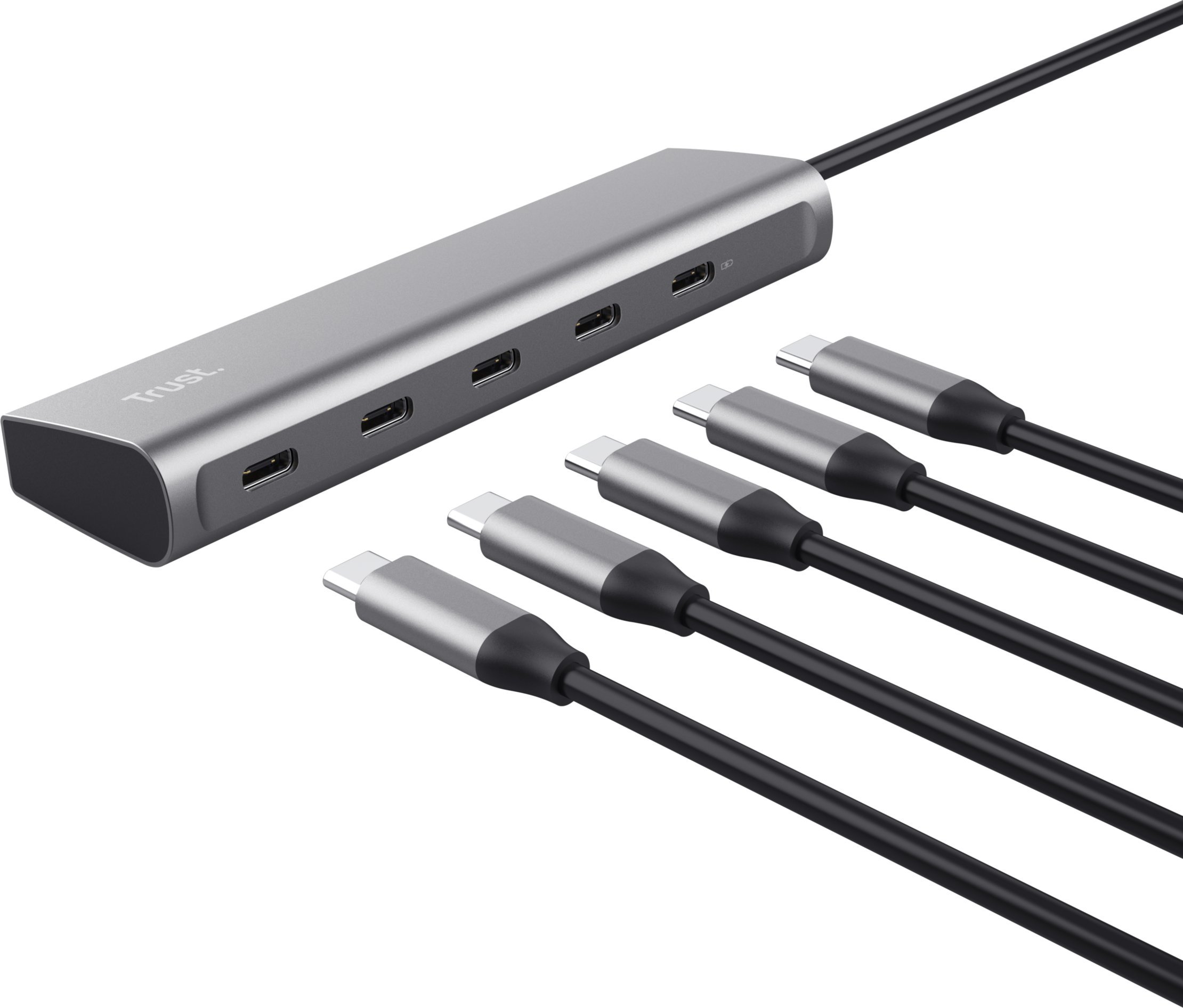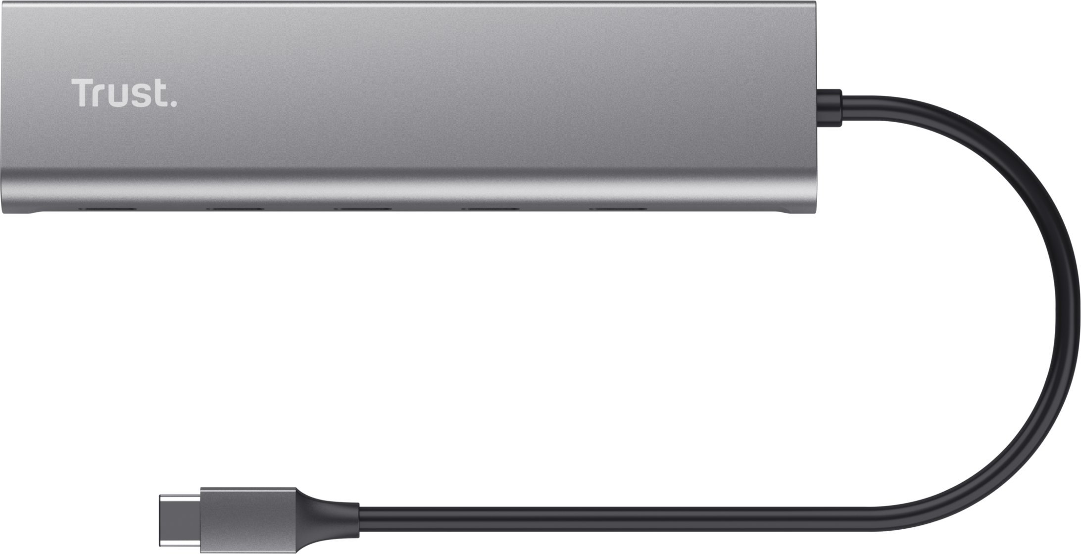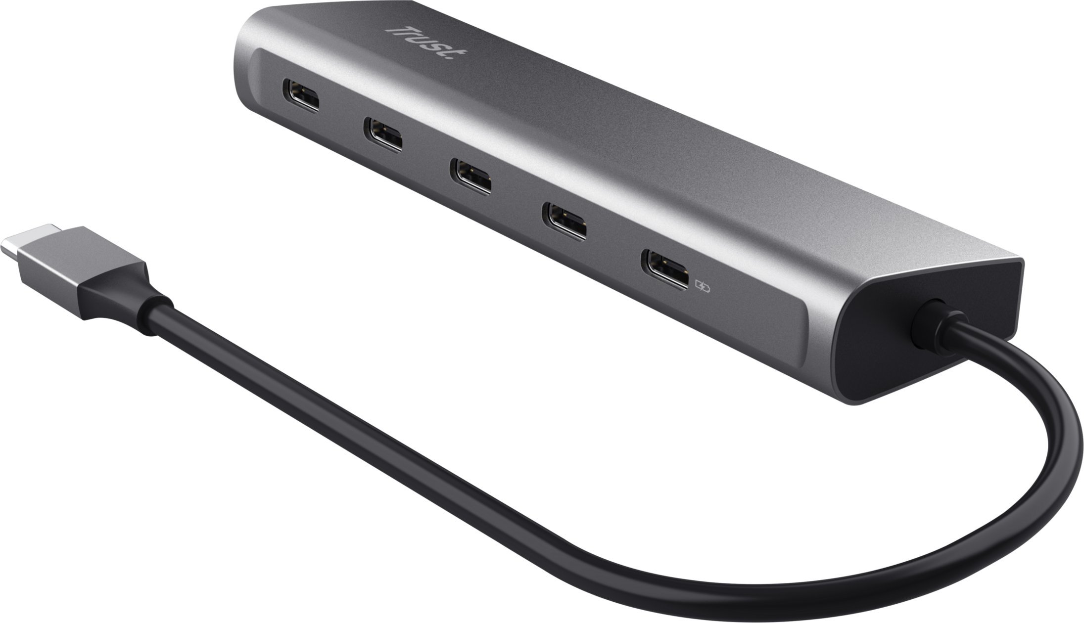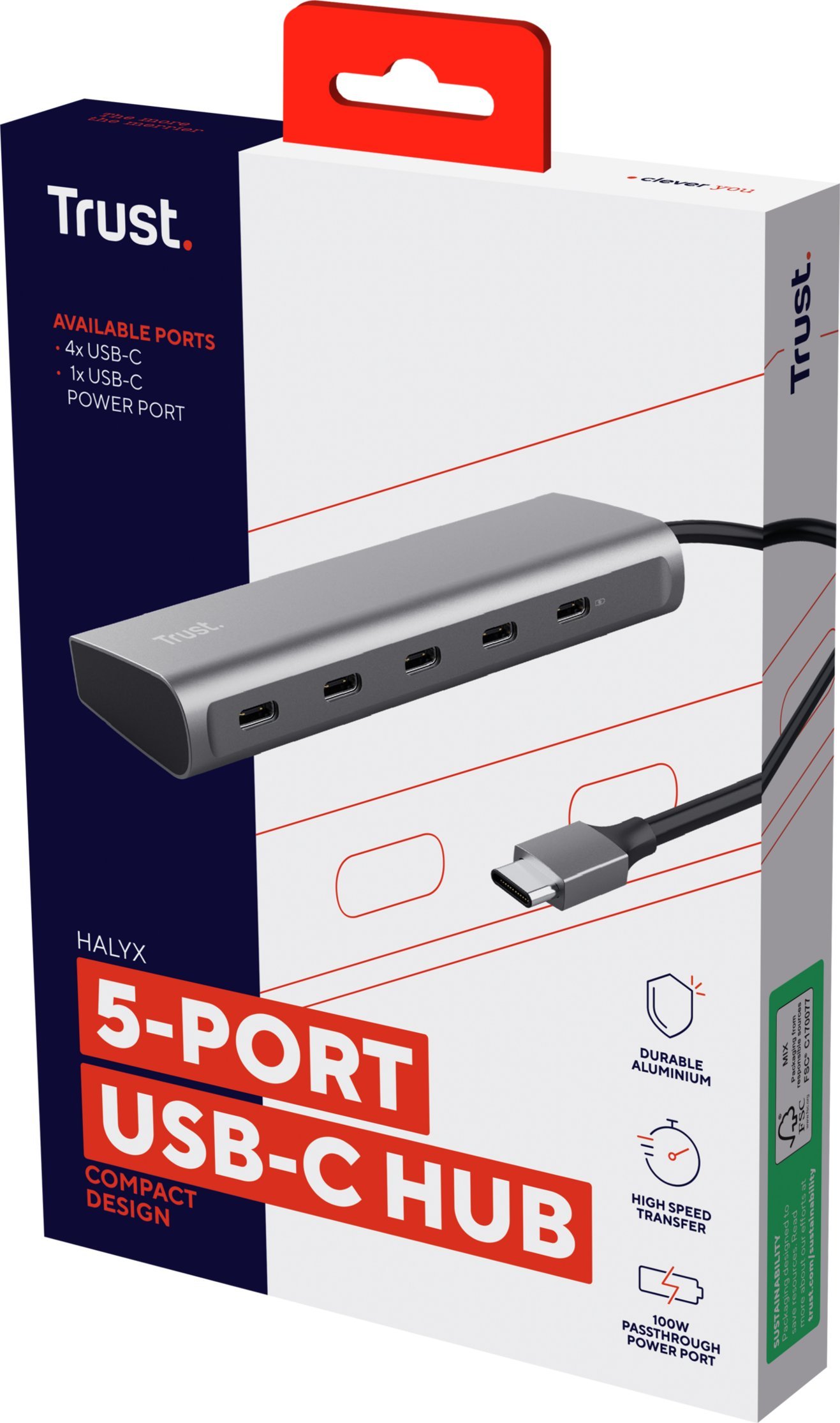 Trust Halyx. Interfejs hosta: USB 3.2 Gen 1 (3.1 Gen 1) Type-C, Interfejsy hub: USB Type-C. Kolor produktu: Srebrny, Materiał obudowy: Kopolimer akrylonitrylo-butadieno-styrenowy (ABS), Maksymalne zasilanie USB: 100 W. Pozostałe obsługiwane systemy operacyjne: ChromeOS. Szerokość produktu: 127 mm, Głębokość produktu: 16 mm, Wysokość produktu: 32 mm. Ilość na paczkę: 1 szt.