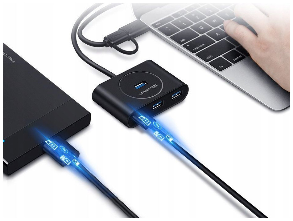 Το HUB είναι ένα στοιχείο πρακτικά απαραίτητο για εργασία σε υπολογιστή. Σας επιτρέπει να αυξήσετε τον αριθμό των διαθέσιμων θυρών USB όταν αυτές που είναι ενσωματωμένες στον υπολογιστή είναι ήδη κατειλημμένες. Χάρη σε αυτό, δεν θα χρειαστεί να αποσυνδέσετε μια συσκευή για να συνδέσετε μια άλλη. Διαθέτει 3 θύρες USB 3.2 Gen 1 με τις οποίες μπορείτε να αντιγράψετε δεδομένα σε ταχύτητες έως και 5 Gbps (625 MB/s). Χάρη στη δυνατότητα σύνδεσης πρόσθετου τροφοδοτικού, θα μπορείτε να συνδέσετε μια εξωτερική μονάδα δίσκου στον υπολογιστή σας μέσω αυτού του HUB.