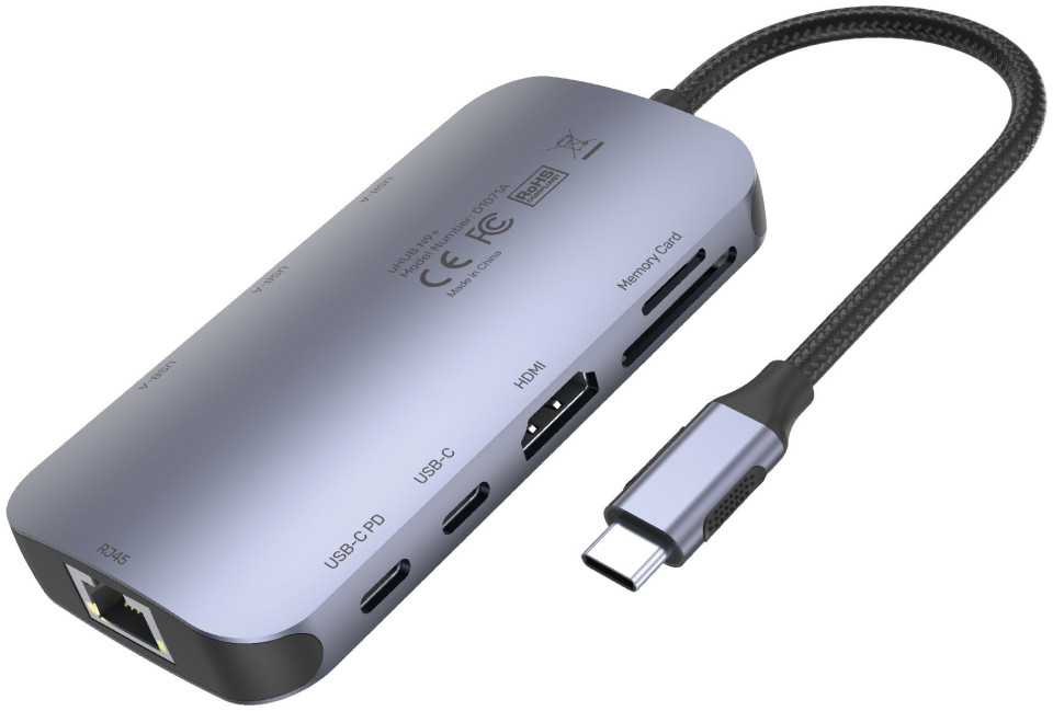 Διανομέας 9 σε 1: 3 x USB-A, 1 x USB-C, 1 x USB-C PD, 1 x HDMI 2.0, 2 x συσκευή ανάγνωσης καρτών, 1 x RJ-45