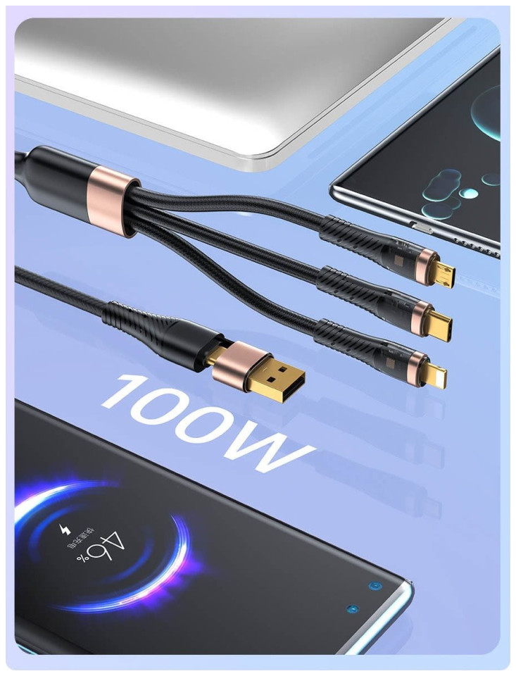 Moc do 100W – szybkie ładowanie i przesył danych. Kabel 2 do 3 – rozdziela jedno złącze na trzy wyjścia, co pozwala ładować wiele urządzeń jednocześnie. Pozłacane złącza – zapewniają lepszą przewodność i trwałość. Ekran LED – pokazuje stan pracy kabla. Pleciony przewód – zwiększona odporność na zużycie i uszkodzenia mechaniczne. Jest to wszechstronny kabel przeznaczony do nowoczesnych urządzeń mobilnych, który oferuje zarówno szybkie ładowanie, jak i stabilny transfer danych.