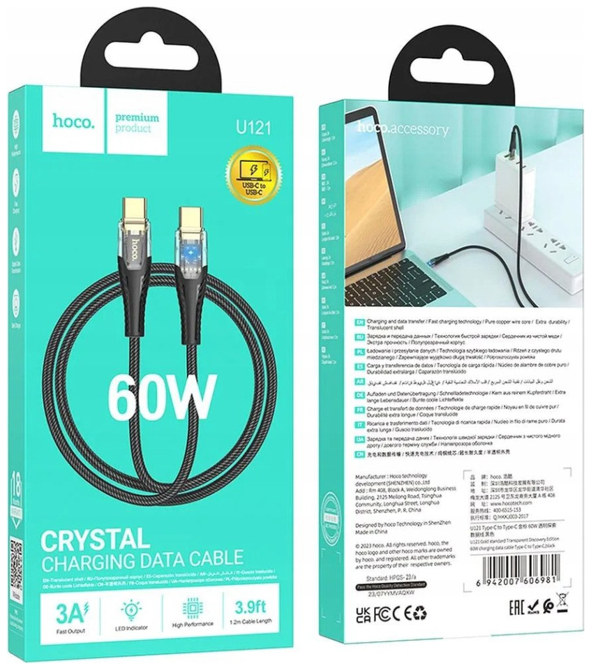 HOCO καλώδιο Τύπου C σε Τύπο C 3A 60W U121 1,2 m μαύρο