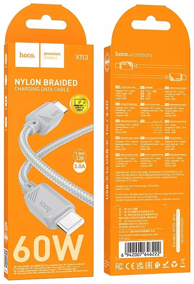 Καλώδιο HOCO Τύπου C σε Τύπου C 3A 60W X113 1 m γκρι