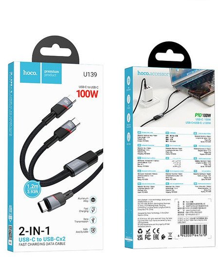 Καλώδιο 2 σε 1 USB C σε USB C / USB C Hoco 5A 100W 1,2 m U139 μαύρο
