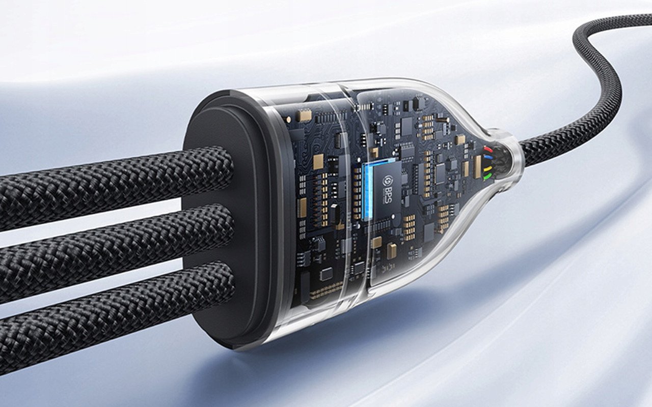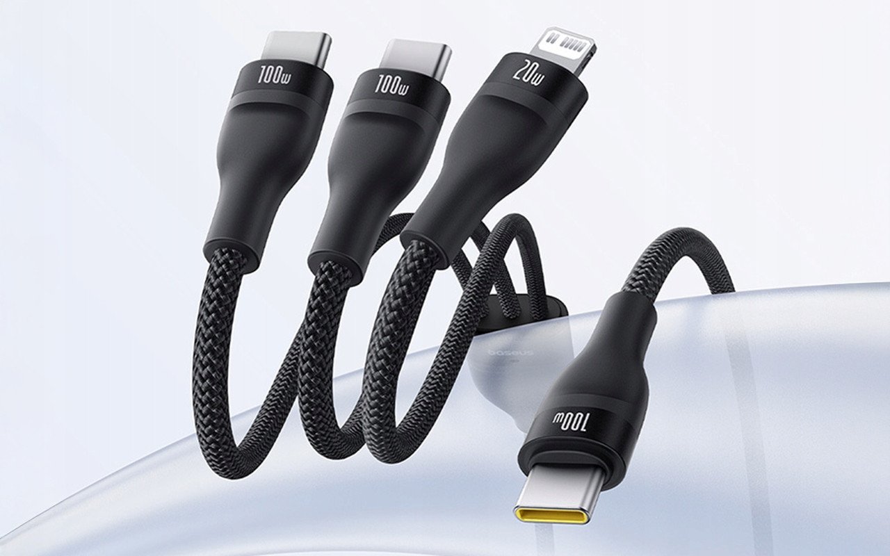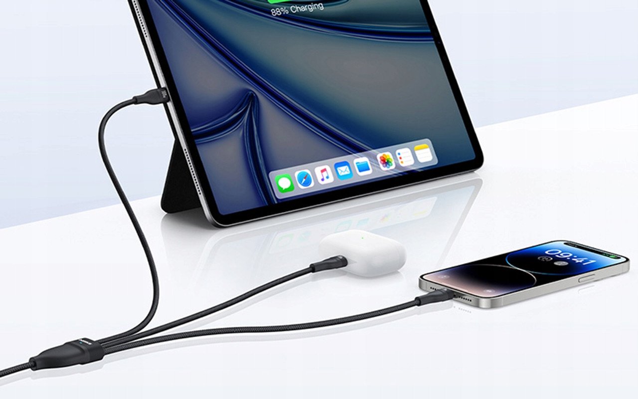 Baseus Flash Series 3w1 posiada dwa złącza USB-C oraz jedno Lightning, co czyni go niezwykle wszechstronnym. Możesz ładować telefon, tablet i laptop jednocześnie bez konieczności używania kilku przewodów.