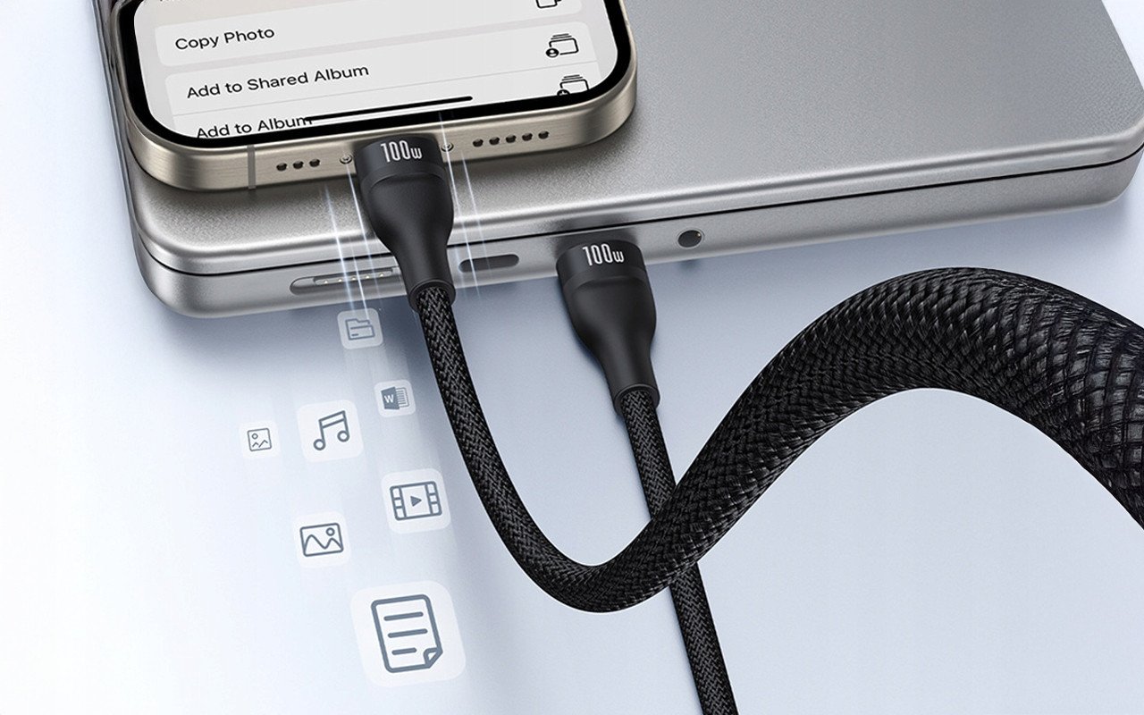 Kabel obsługuje technologię PD 100W, co oznacza, że jest w stanie naładować laptopa w mniej niż 2 godziny. Maksymalna moc dla jednego portu USB-C wynosi 100W, a dla portu Lightning 20W.