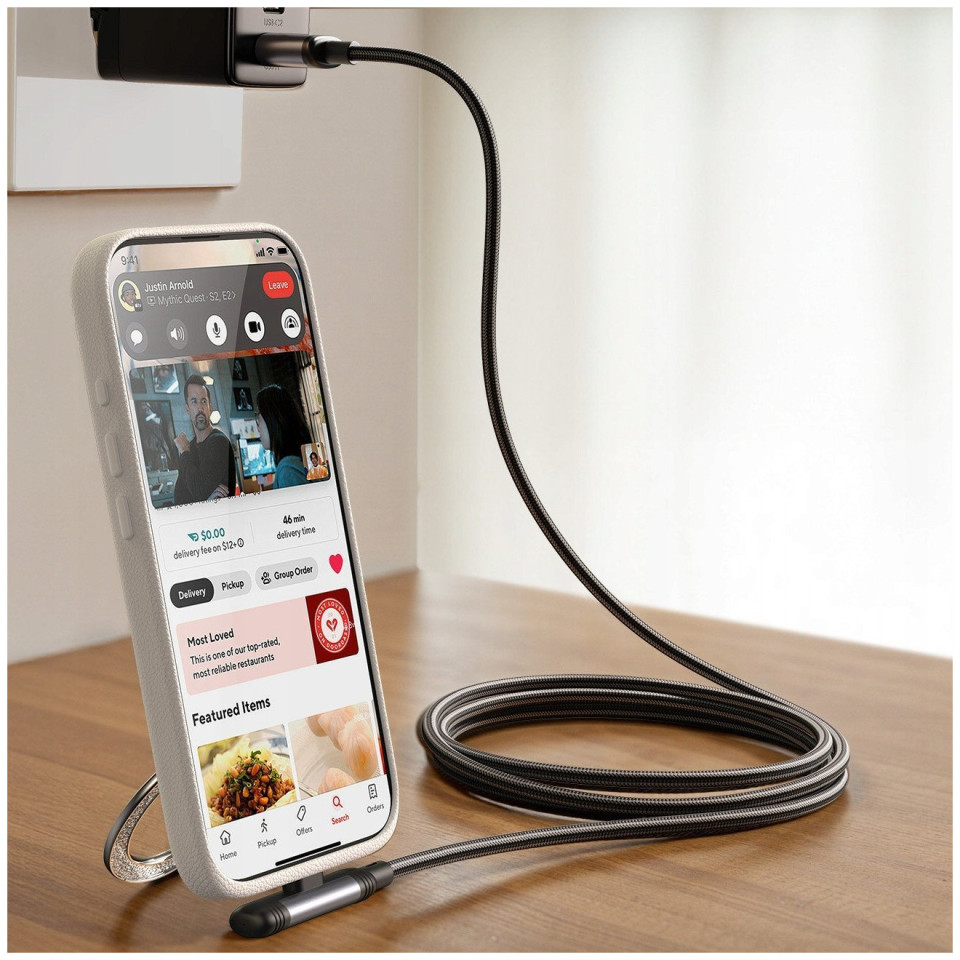 - Kątowa końcówka 90°: wygodne użytkowanie telefonu podczas ładowania, bez naprężeń kabla.